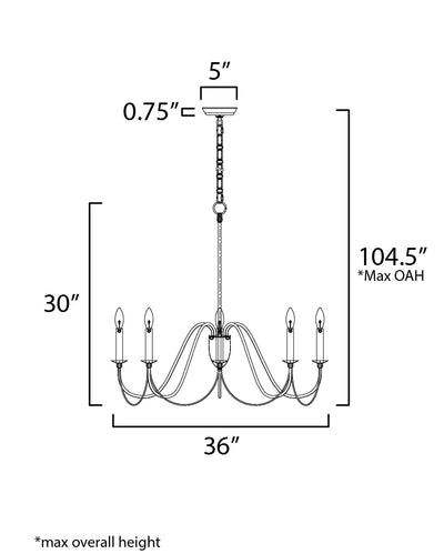 Sweeping metal accents links create classic curves on a minimalist chandelier. Available in hand-rubbed Chestnut Bronze or elegant Gold Leaf finishes. Add crystal accents to elevate the design for a more extravagant glamour. The design manages to evoke French Country charm and enchants any room it illuminates.