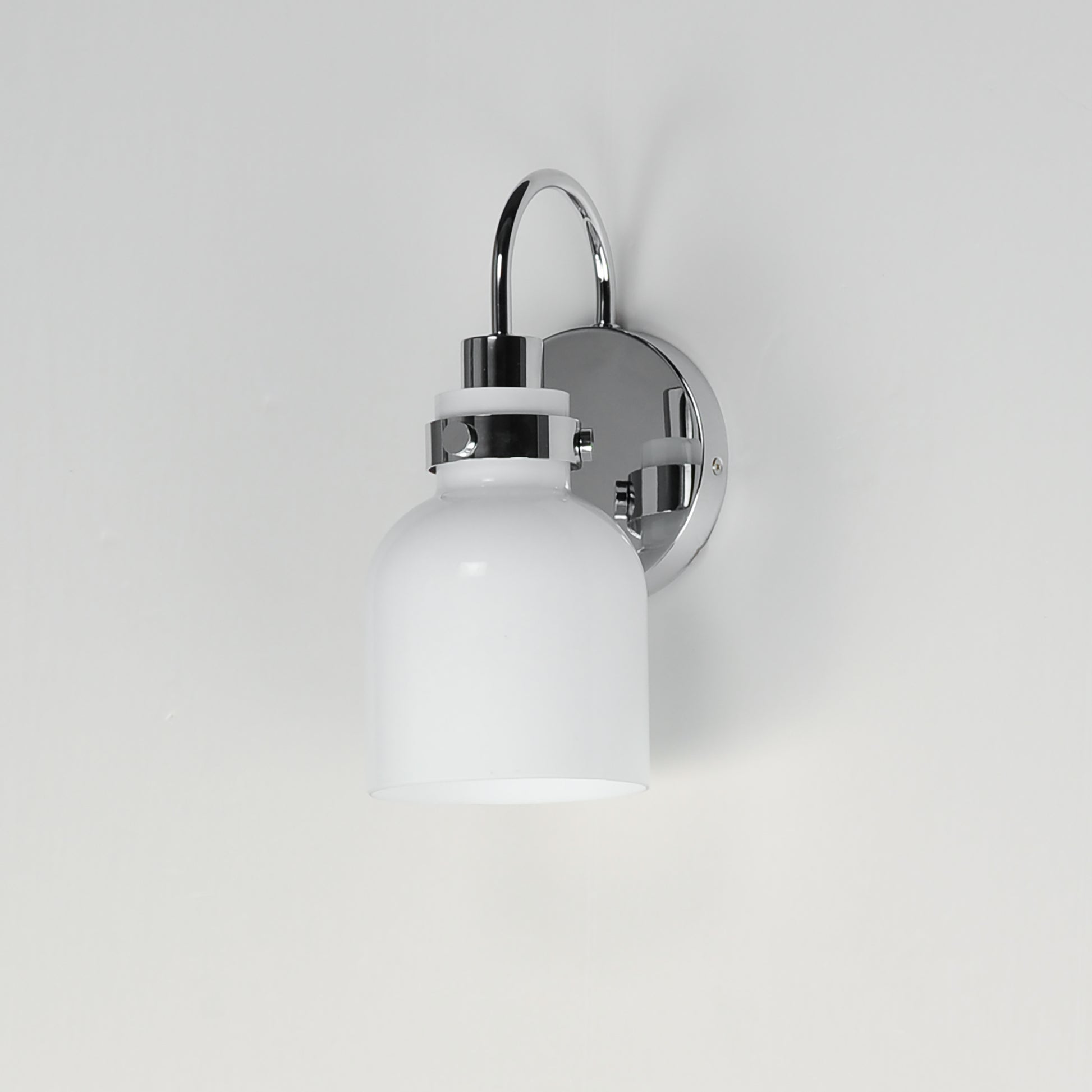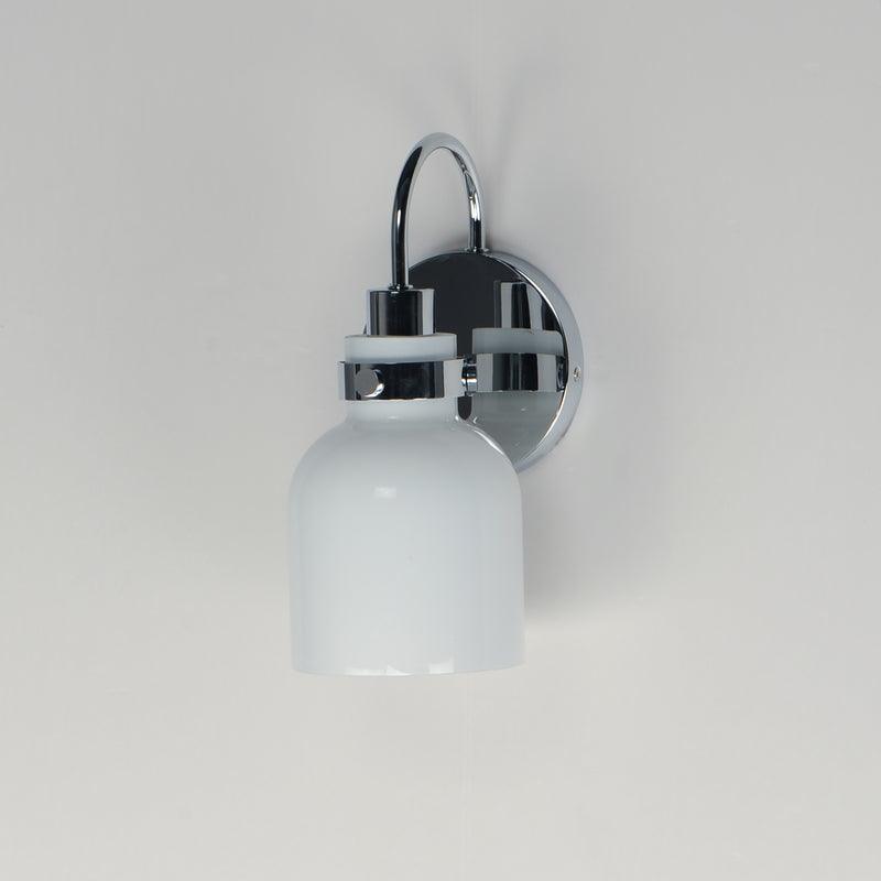 Celebrate nostalgia using these sconces that feature opal White glass shades in a bell shape. Supported on rings of metal in your choice of Polished Chrome or a bolder two-tone Black and Satin Brass, this refreshing take plays into a retro aesthetic of your bathroom decor. Available in various lengths of bath vanity lights or single sconces.
