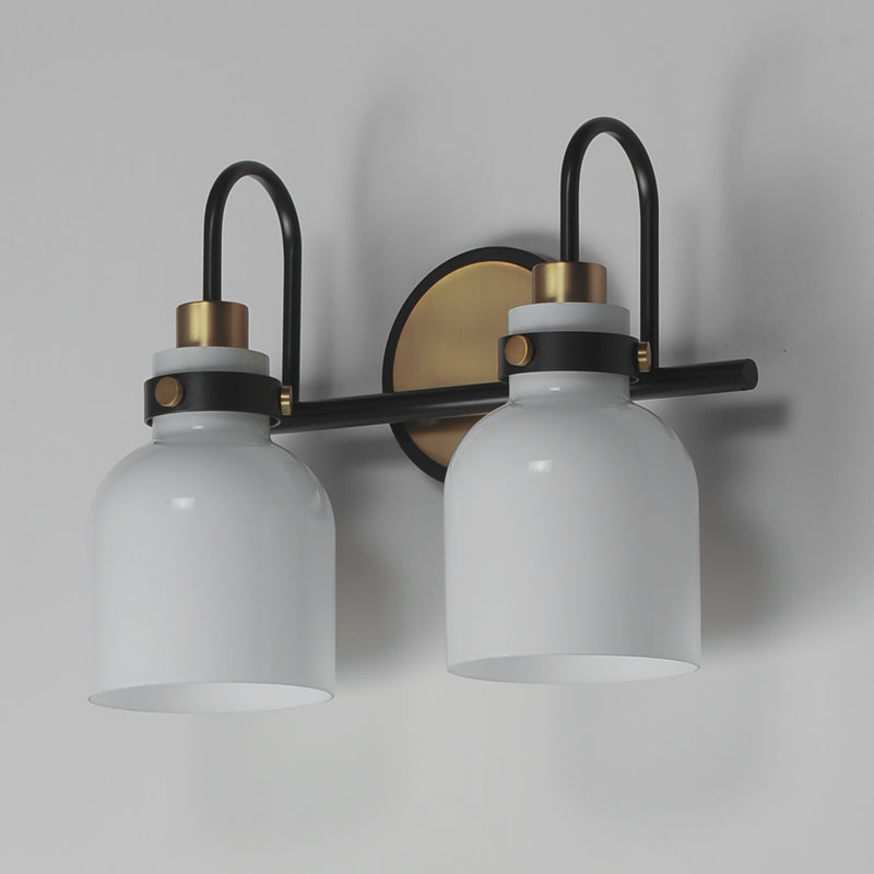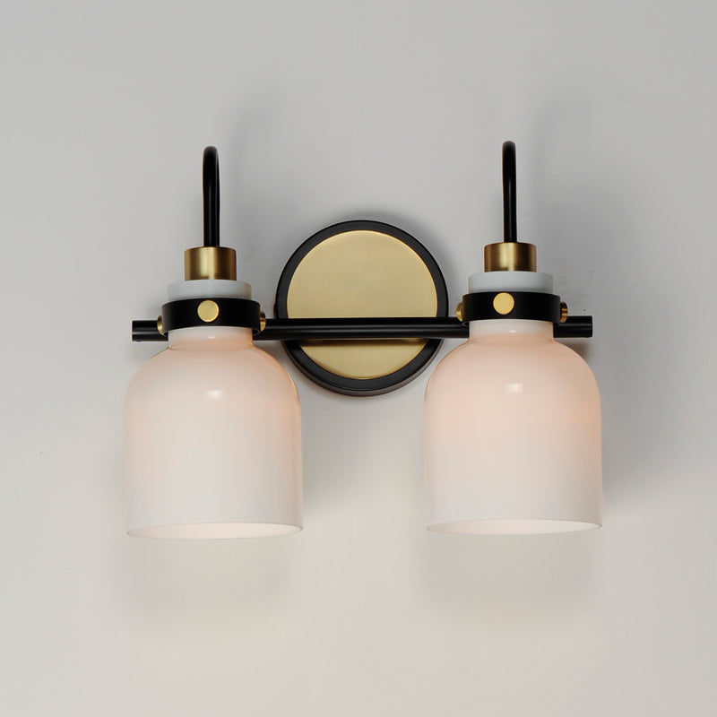 Celebrate nostalgia using these sconces that feature opal White glass shades in a bell shape. Supported on rings of metal in your choice of Polished Chrome or a bolder two-tone Black and Satin Brass, this refreshing take plays into a retro aesthetic of your bathroom decor. Available in various lengths of bath vanity lights or single sconces.