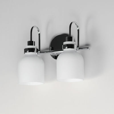 Celebrate nostalgia using these sconces that feature opal White glass shades in a bell shape. Supported on rings of metal in your choice of Polished Chrome or a bolder two-tone Black and Satin Brass, this refreshing take plays into a retro aesthetic of your bathroom decor. Available in various lengths of bath vanity lights or single sconces.