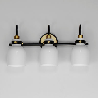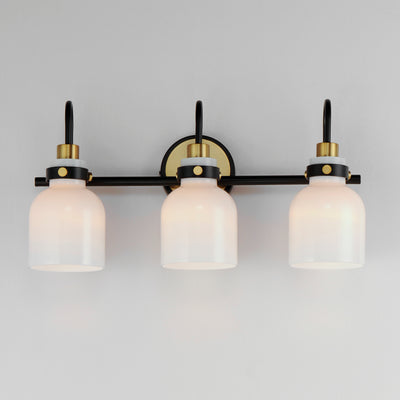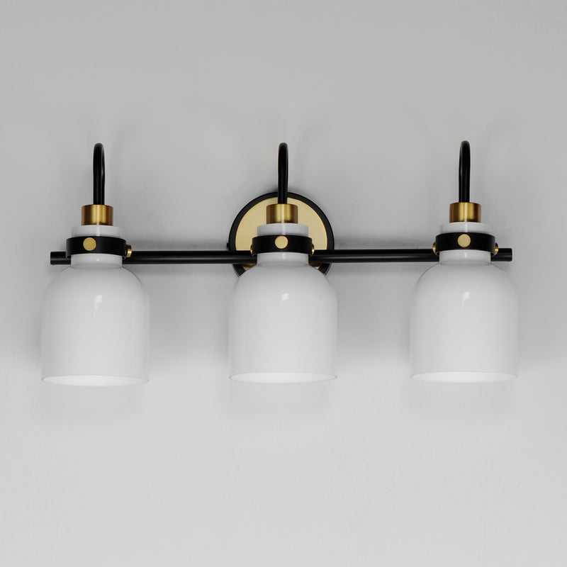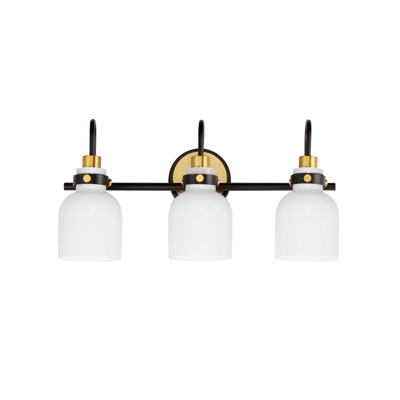Celebrate nostalgia using these sconces that feature opal White glass shades in a bell shape. Supported on rings of metal in your choice of Polished Chrome or a bolder two-tone Black and Satin Brass, this refreshing take plays into a retro aesthetic of your bathroom decor. Available in various lengths of bath vanity lights or single sconces.