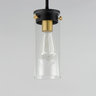 Simple clear glass cylinders are secured by decorative thumb screws in this transitional collection of sconces and pendants both neutral in design and suitable for damp applications. Choose from Satin Nickel or a two-tone Black and Satin Brass finish to pair with popular interior finishes in hardware, plumbing and decor.