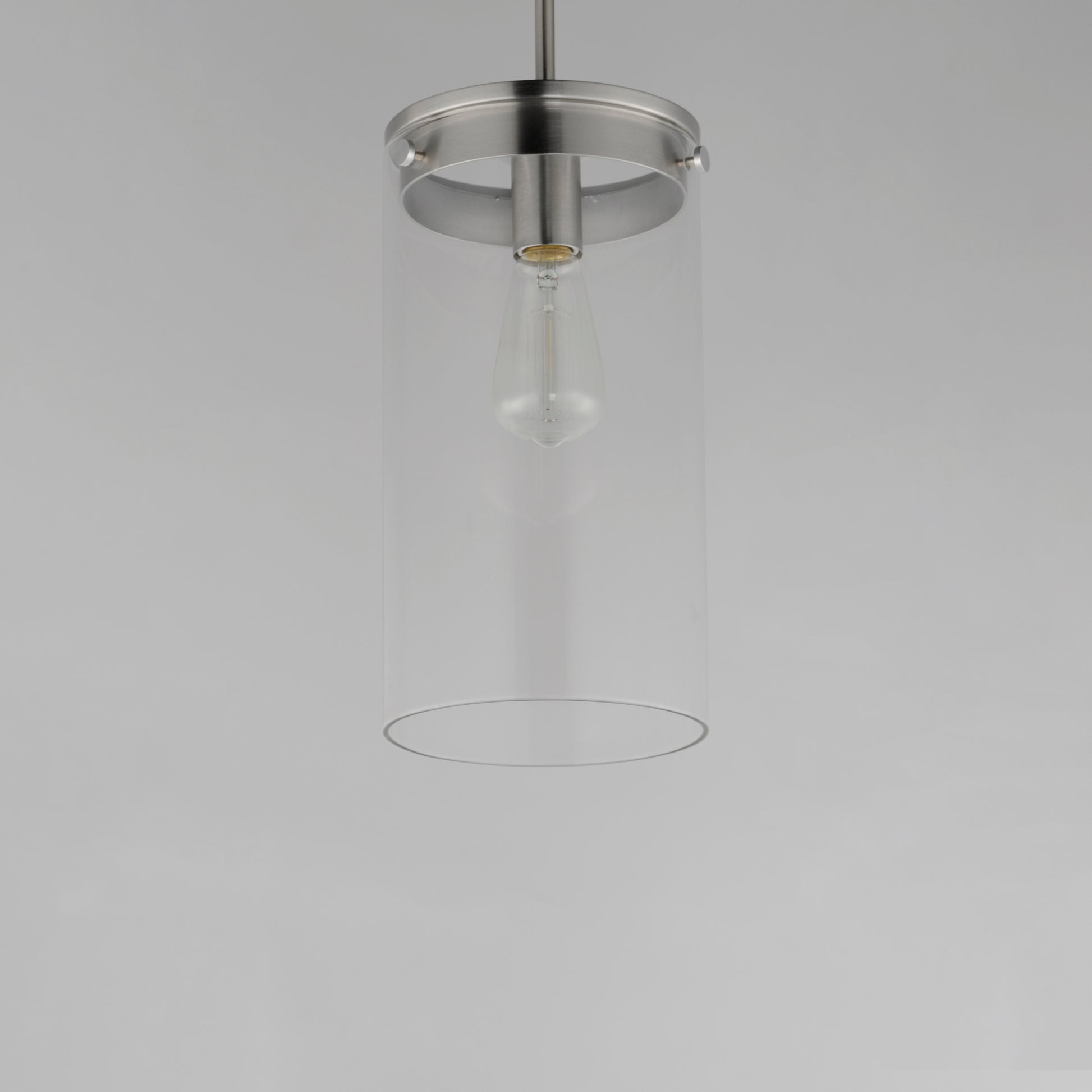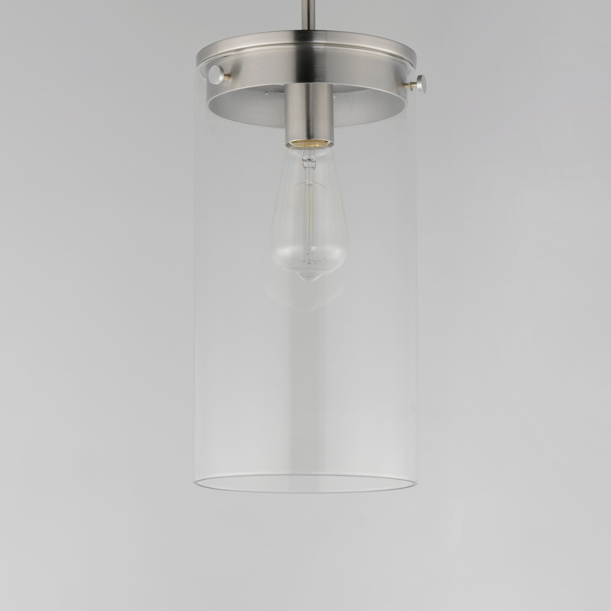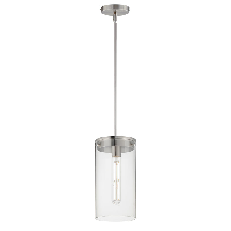Simple clear glass cylinders are secured by decorative thumb screws in this transitional collection of sconces and pendants both neutral in design and suitable for damp applications. Choose from Satin Nickel or a two-tone Black and Satin Brass finish to pair with popular interior finishes in hardware, plumbing and decor.