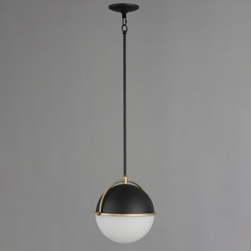 Tasteful globes constructed of metal and glass halves are combined and suspended by an arc-shaped yoke structure. The top dome of robust steel support lower halves of Satin White glass shades that twist lock on for convenience of installation and maintenance. Available in Matte Black with contrasting Weathered Brass or Satin Nickel with Satin Brass two tone finishes, the series includes a full range of products including flush mount, semi-flush mount, single and multi-pendant configurations, and spec-worthy sconces. This attractive design is sure to enhance your projects most needed spaces with an enduring appeal to the design that works in a variety of aesthetics.