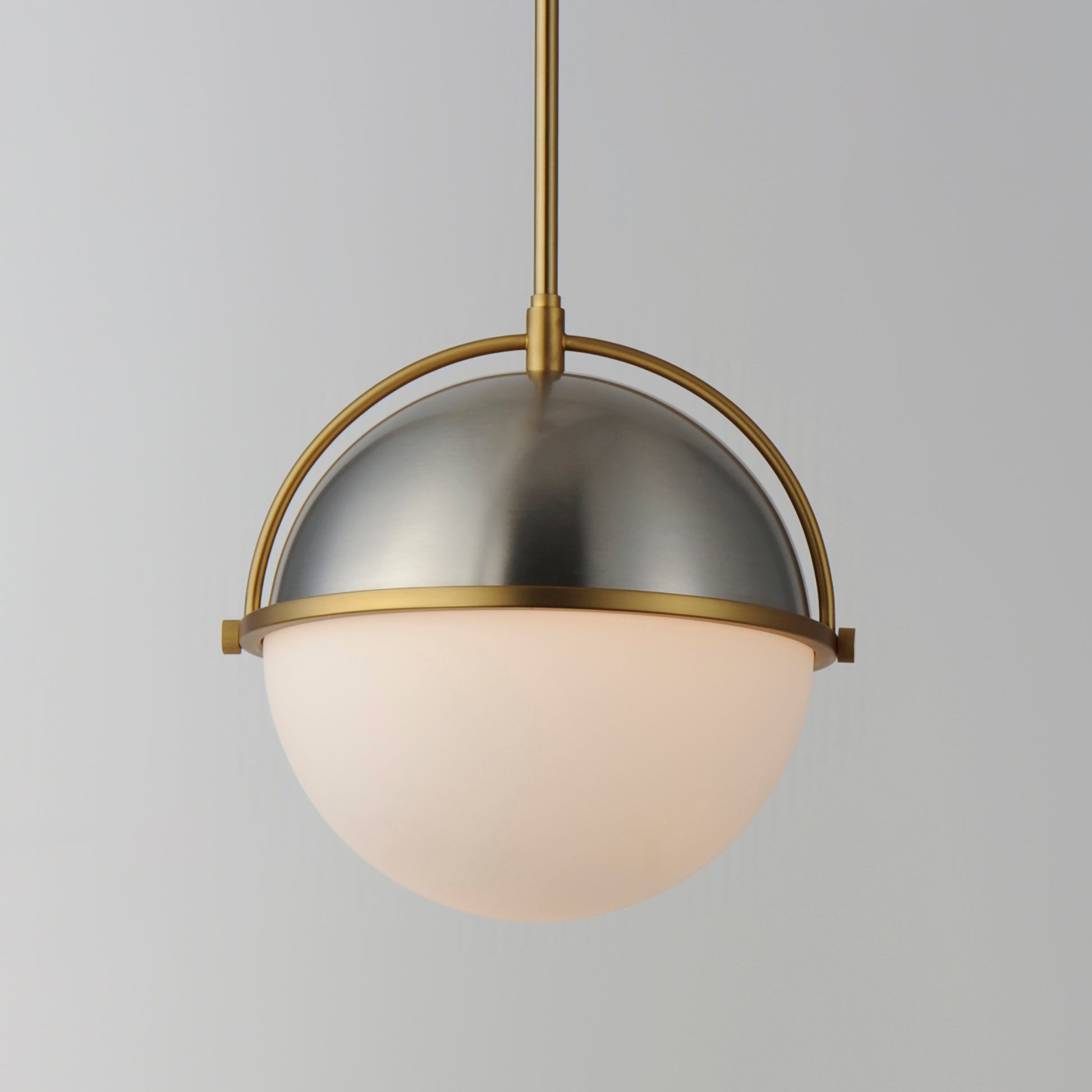 Tasteful globes constructed of metal and glass halves are combined and suspended by an arc-shaped yoke structure. The top dome of robust steel support lower halves of Satin White glass shades that twist lock on for convenience of installation and maintenance. Available in Matte Black with contrasting Weathered Brass or Satin Nickel with Satin Brass two tone finishes, the series includes a full range of products including flush mount, semi-flush mount, single and multi-pendant configurations, and spec-worthy sconces. This attractive design is sure to enhance your projects most needed spaces with an enduring appeal to the design that works in a variety of aesthetics.