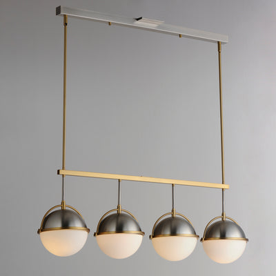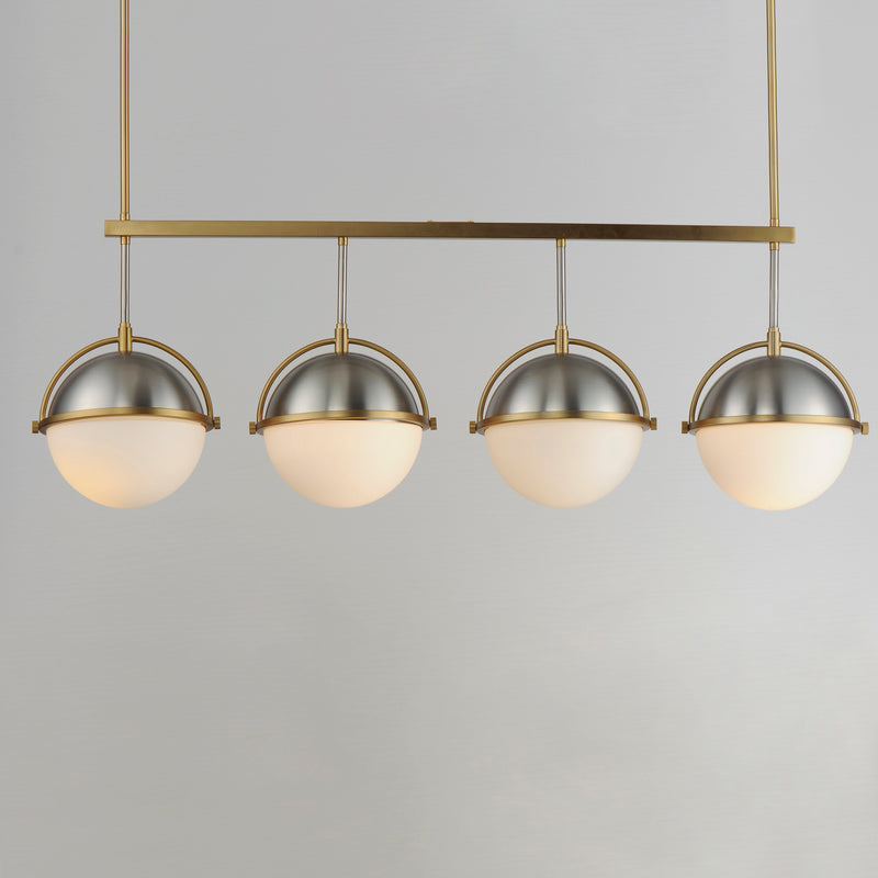 Tasteful globes constructed of metal and glass halves are combined and suspended by an arc-shaped yoke structure. The top dome of robust steel support lower halves of Satin White glass shades that twist lock on for convenience of installation and maintenance. Available in Matte Black with contrasting Weathered Brass or Satin Nickel with Satin Brass two tone finishes, the series includes a full range of products including flush mount, semi-flush mount, single and multi-pendant configurations, and spec-worthy sconces. This attractive design is sure to enhance your projects most needed spaces with an enduring appeal to the design that works in a variety of aesthetics.