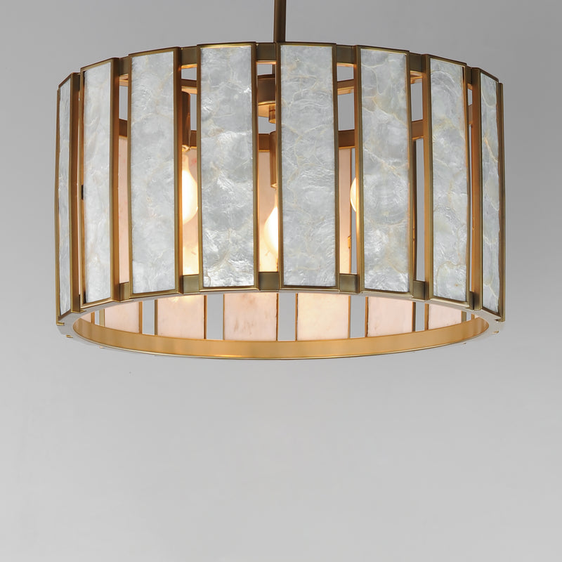 Classic in form and evoking the sea, laminae of Capiz shell are framed in paneled drum shapes. The Natural Aged Brass finish refines the coastal elements and complements the warm glow from behind the translucent panels. Available in 3 configurations of pendants and a tall ADA-compliant wall sconce, the collection offers a sophisticated approach at coastal design.