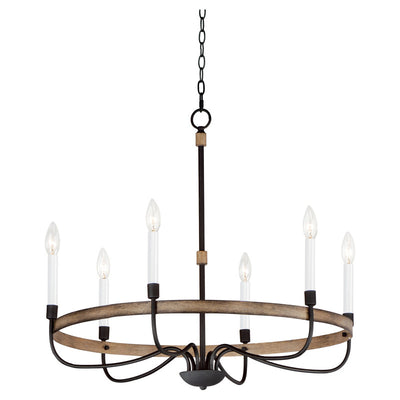 Rustic charm in an elegant, yet simple chandelier with warm distressed wood finishes and textured black metal arms. White candle covers evoke wax candles to complete the classic and transitional appeal of this series. The flush mount features a satin white diffuser to soften the lamps within.