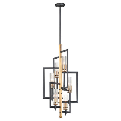 An exquisite collection featuring scalloped cylindrical Clear glass shades on unique metal frames finished in a combination of Black and Antique Brass. The cascading design of the chandeliers can be paired over a dining table or used as an entry fixture.