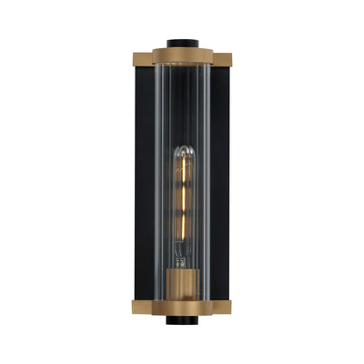 Internally ribbed clear glass tubes refract tubular lamps, creating a shimmering light effect. The glass is supported by a two-tone black frame with Aged Brass accents, making this sconce suitable for both indoor and outdoor installations. With a depth of less than 4 inches, this ADA compliant sconce may also be used in commercial applications. .
