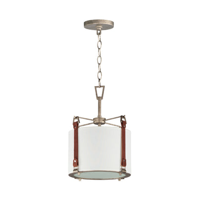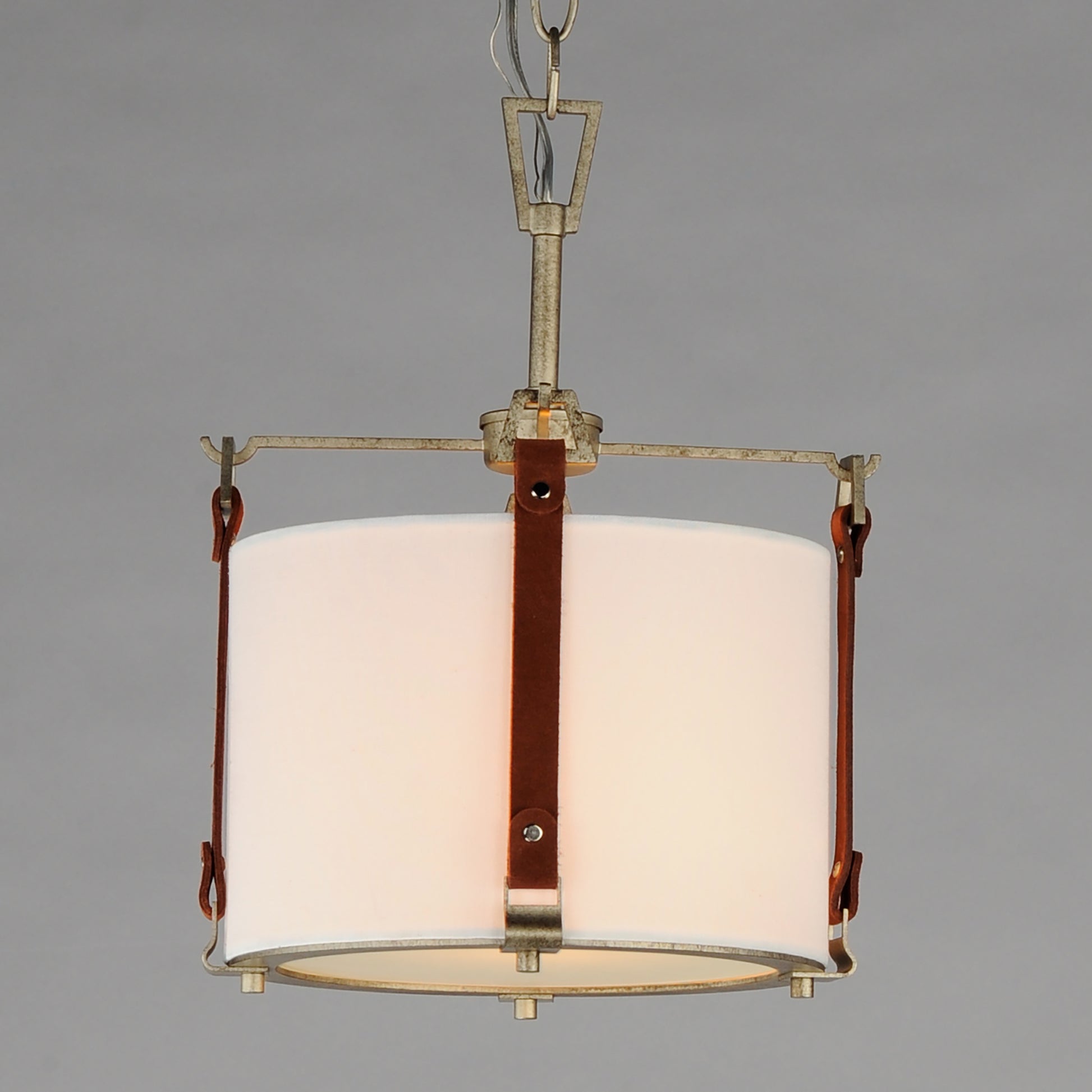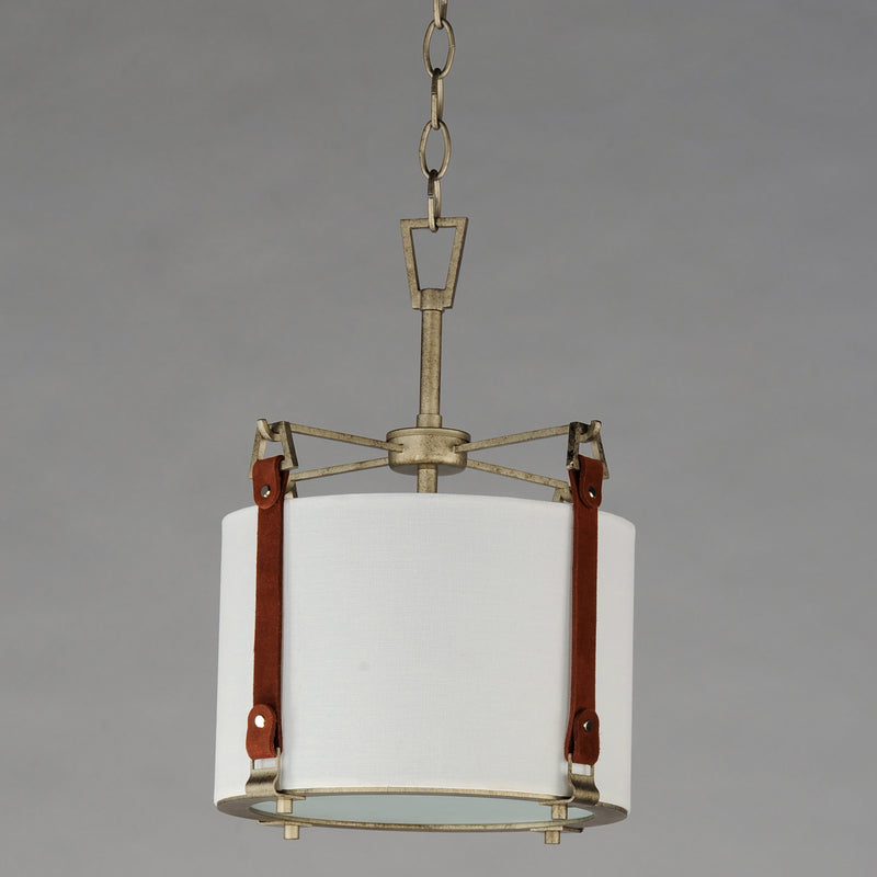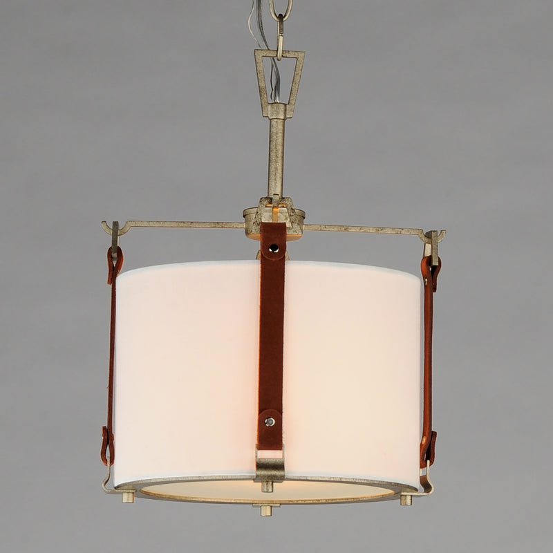 Inspired by the artist enclave north of San Francisco, pastoral elements influence this series of drum shades. Stirrup-like hooks support genuine suede straps in a Tobacco Brown finish which in turn suspend drum shades in an Off-white linen fabric. Metalwork in a hand-applied Weathered Zinc finish frame the frosted glass diffuser at the bottom to softly diffuse the lighting within. Head out West with this rustic, yet refined design.