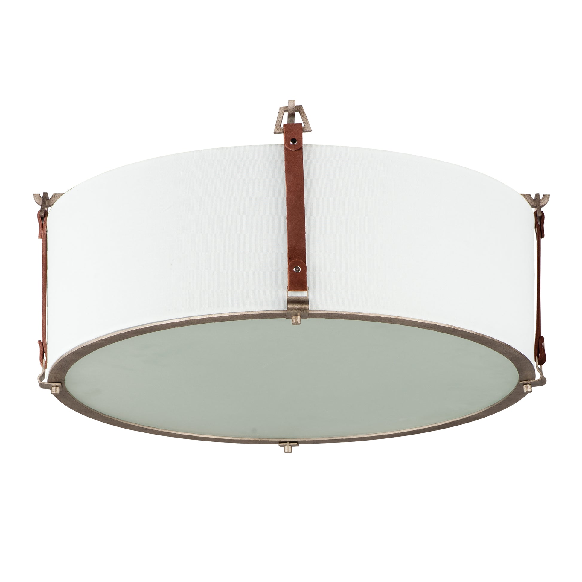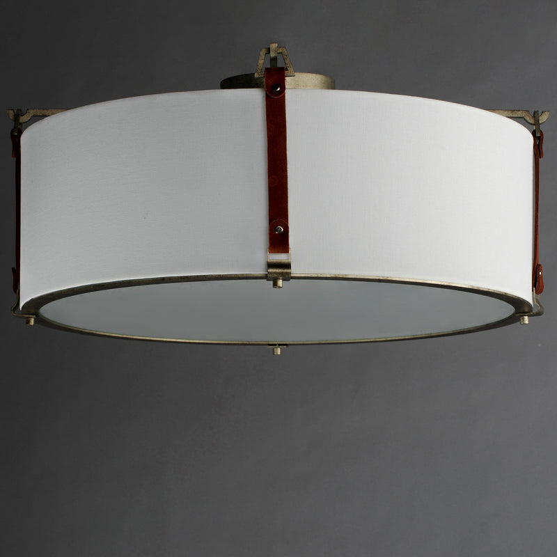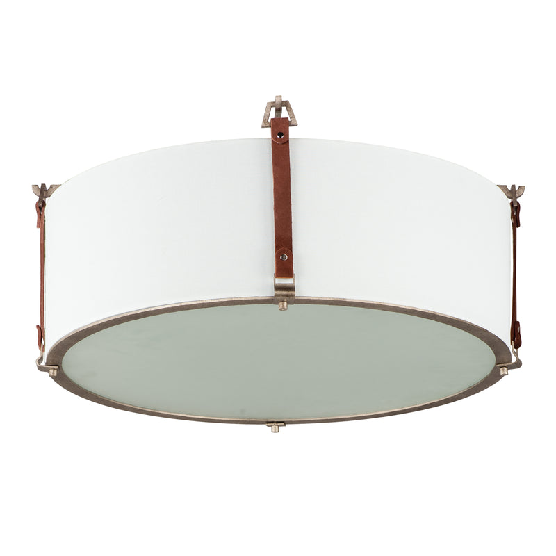 Inspired by the artist enclave north of San Francisco, pastoral elements influence this series of drum shades. Stirrup-like hooks support genuine suede straps in a Tobacco Brown finish which in turn suspend drum shades in an Off-white linen fabric. Metalwork in a hand-applied Weathered Zinc finish frame the frosted glass diffuser at the bottom to softly diffuse the lighting within. Head out West with this rustic, yet refined design.
