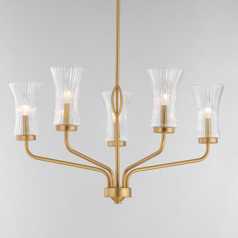 Incorporating classical elements throughout, this collection delivers a refreshingly transitional design aesthetic. An open wrought-iron break at the chandelier's stem supports upward curving round tubes that terminate at Clear Ribbed glass shades. Finished in a Natural Aged Brass finish, the collection complements a variety of design aesthetics.