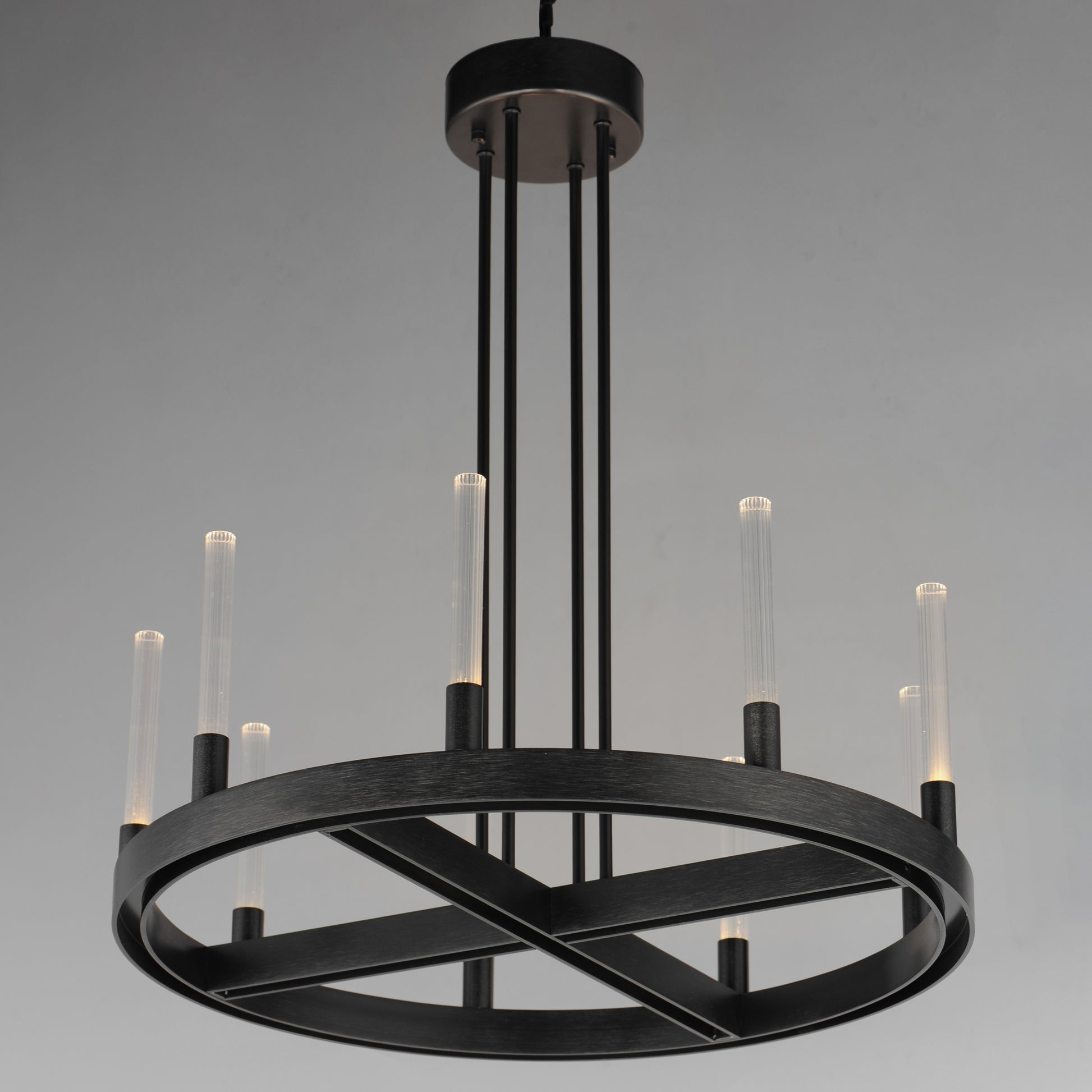 A modern tribute to the wheel chandelier, the Ovation collection integrates LED technology for a dazzling lighting effect. The LED light produces a shimmering lighting effect along the tall and narrow fluted glass shades adding celebratory effervescence. The expansive diameters of the rings join at the center in equipoise using four down rods to suspend the frame. Mount the chandelier from the collector or make use of additional chain supplied to extend the height with ease. Additional sconces with up and down lighting complete the design. Available in Brushed Brass or Black, the collection toasts a classic design creating an elegant statement.