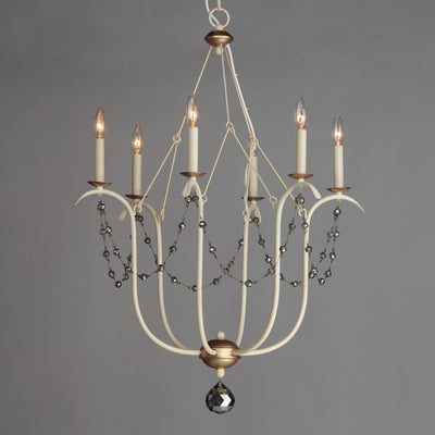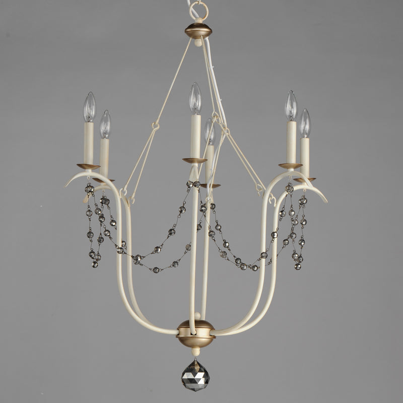 This series draws inspiration from regal agrarian manors, delivering a statement in its scale and sophisticated finishes. Designed in operatic proportions, the bottom chandelier assembly features swollen curves hand painted in a choice of Ecru White or Golden Noir and suspended by a rigid hook structure replete with vintage charm. These finish combinations not only add dimension and interest, but they are enhanced with the contrastingly brighter accents against the rich, weathered finishes. Extended chain links with smoky beveled crystal charms drape the Ecru and Gold Leaf finish combination, while the darker Golden Noir variation features strands of patinaed silver wooden beads.
