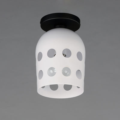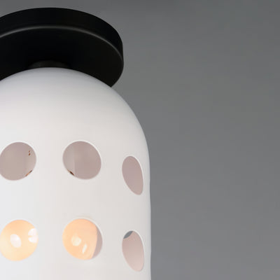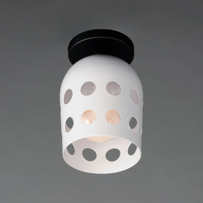 Retro configurations of Mid-Century Modern perforated metal designs inspire this collection of pendants, wall and ceiling mounts complete in a two tone powder coat finish. The spun metal shades are punched with large circular perforations that scatter a pattern of light when lit. Finished in a clean, two-tone Matte White and Black powder coat, these pieces add cheerful character to their space. The oversized shades on the wall sconce and portable lamps also feature a swivel joint that allow you to position the shade and direct the light with ease. A convenient switch on the back of the shade operates a 3-step dimmer to adjust the lamp's brightness at the touch of a button.