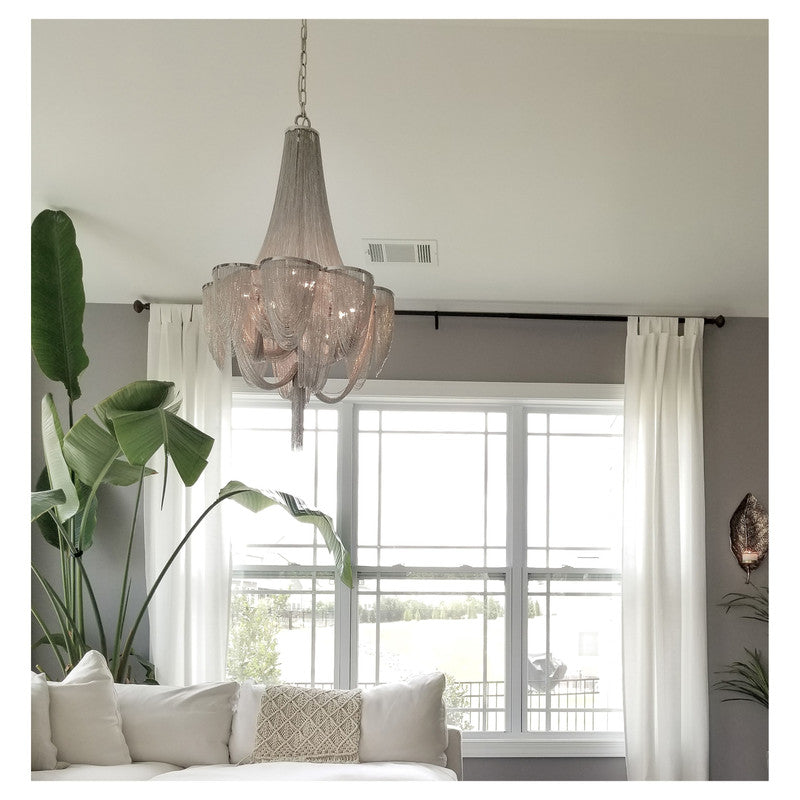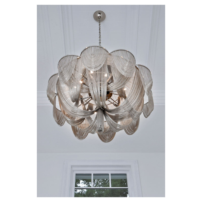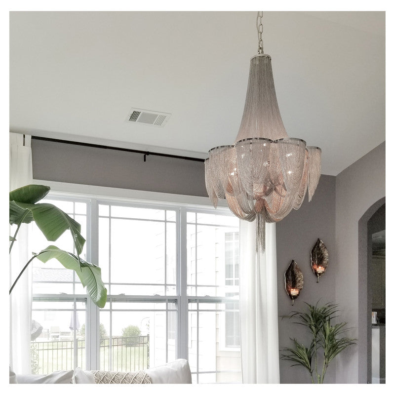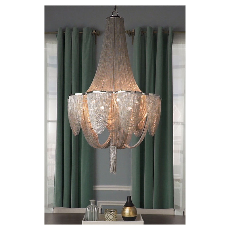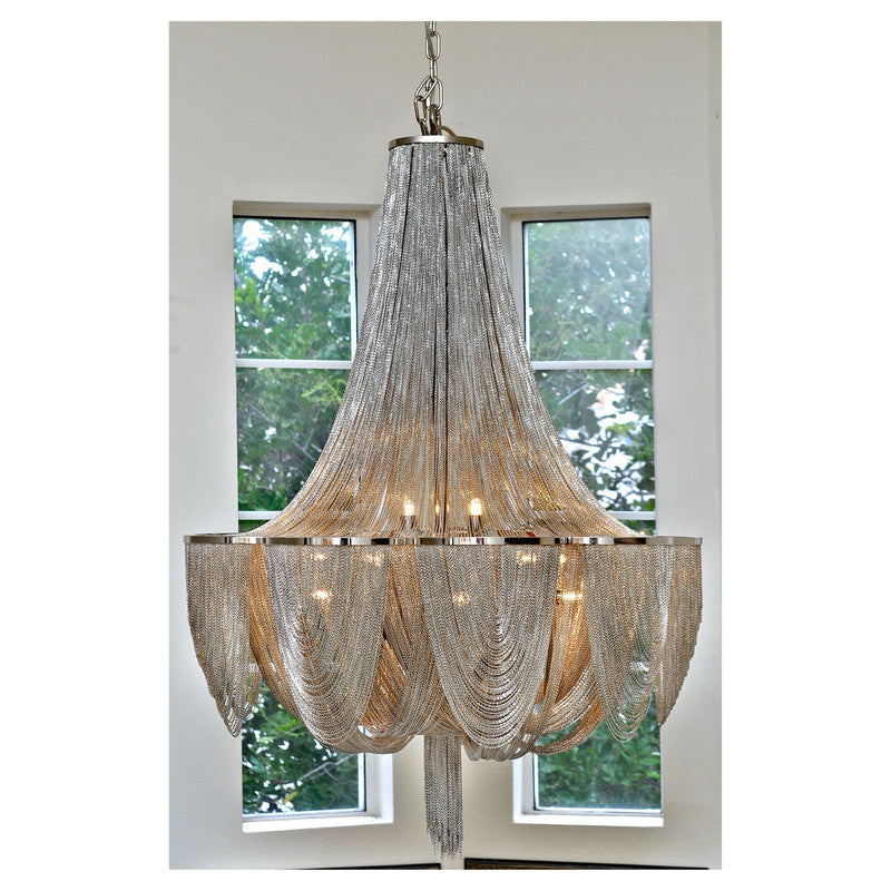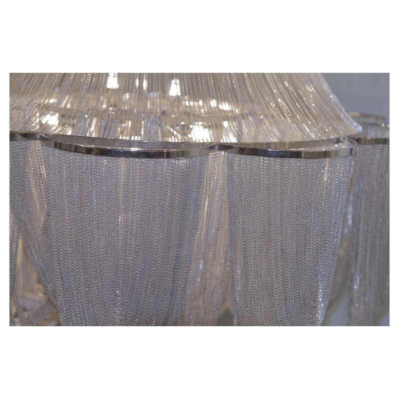 Chantilly collection features metal frames gracefully draped with Nickel finished jewelry chain. Metal trim rings of Polished Nickel add sharp contrast to the softness of the chain, which conceals the xenon light source.