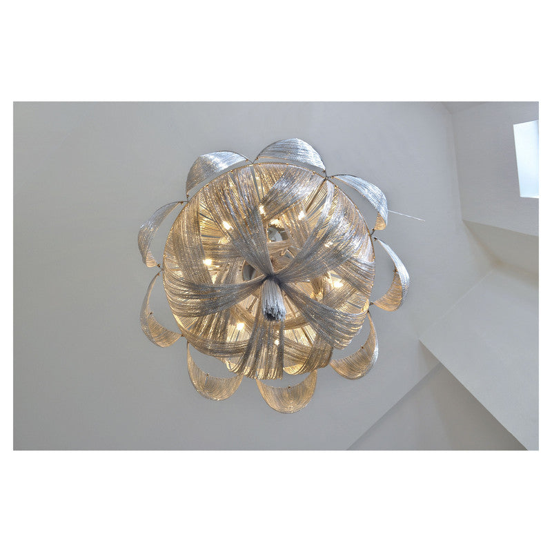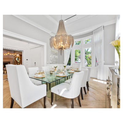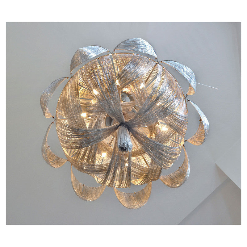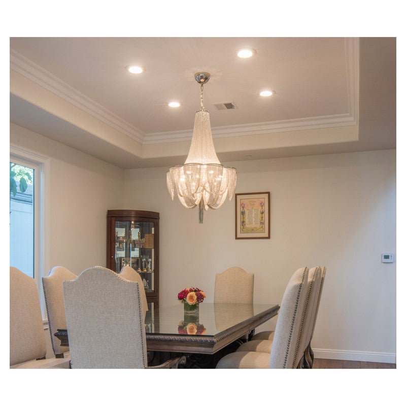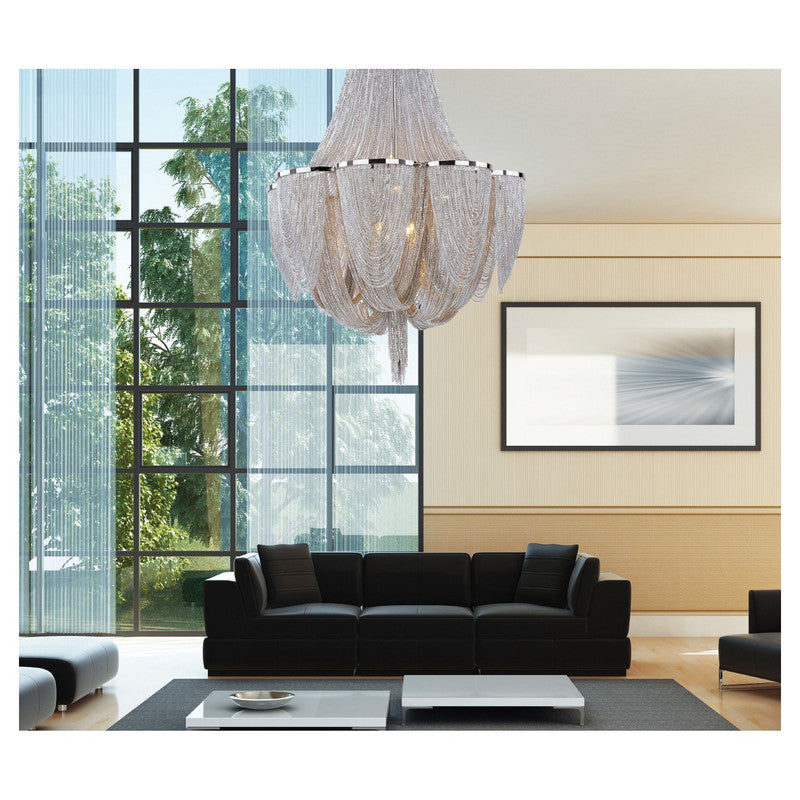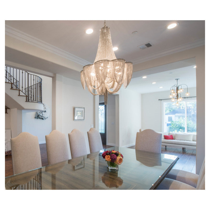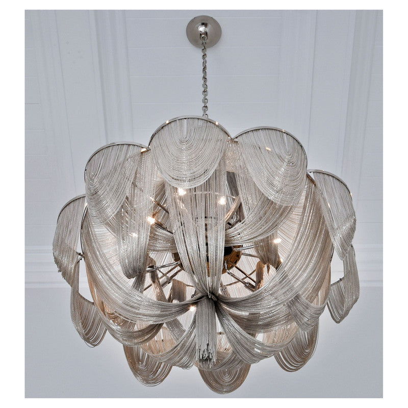Chantilly collection features metal frames gracefully draped with Nickel finished jewelry chain. Metal trim rings of Polished Nickel add sharp contrast to the softness of the chain, which conceals the xenon light source.