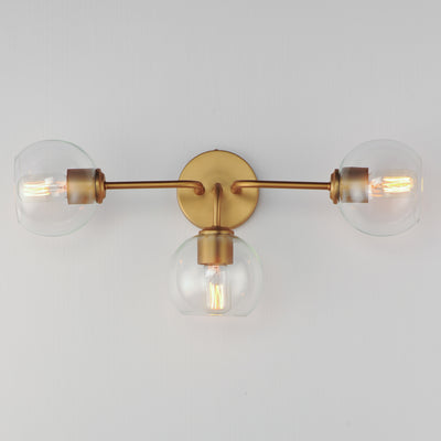 Clear glass globes on a Natural Aged Brass frame create a transitional design that is sure to please. The sloping arms level out to create a simple Mid Century Modern configuration. A full range of the products in this collection include chandeliers, pendants, flush mounts, and sconces.