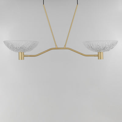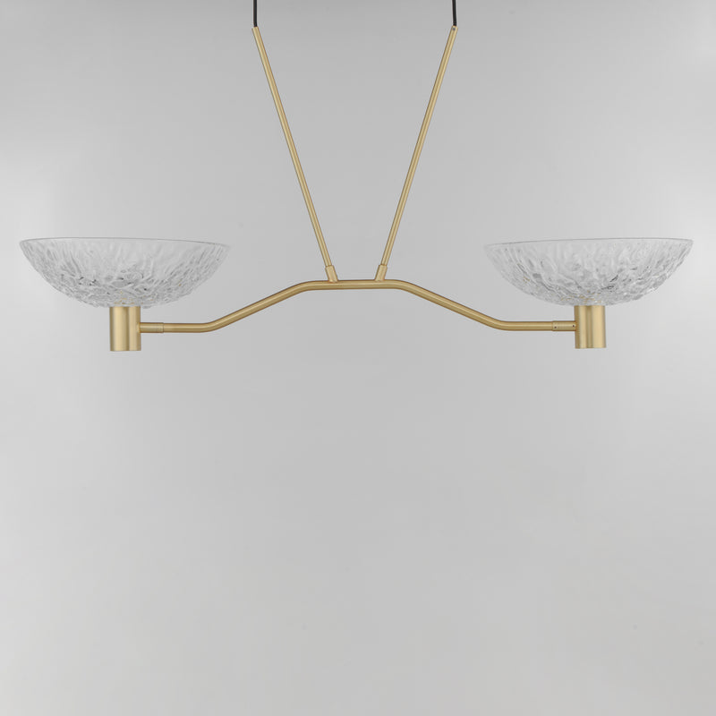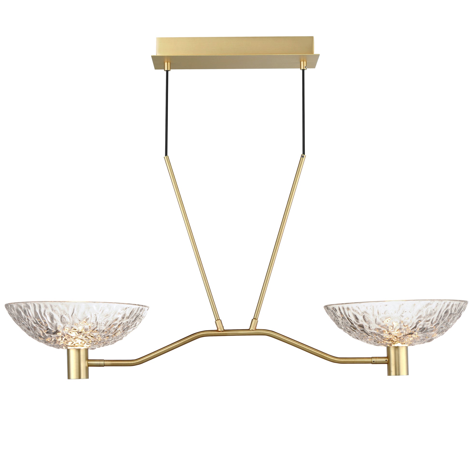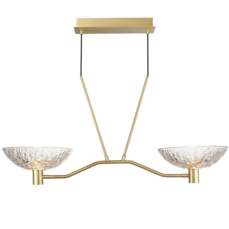 A modern take on the classic torchiere, the bright Satin Brass frames support thick textured glass cauldrons illuminated with dedicated LED modules. The 2-Light pendant and swing arm pin-up sconce feature rotatable shades directing the light either upward or cast directionally downward. The deep pattern in the glass sparks curiosity and fascination with its organic and abstract surface. It creates interest in the LED light source behind it while casting even light through the artistic vessels' design. Available in various configurations of pendants and sconces, the collection celebrates classic design concepts in an understated contemporary glamor that results in a composition suited to transitional and contemporary aesthetics. Make a statement with the oversized with the 3-light sconce nearly five foot in height or use the multiple functional pieces for reading our over an island.