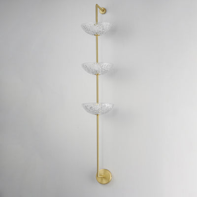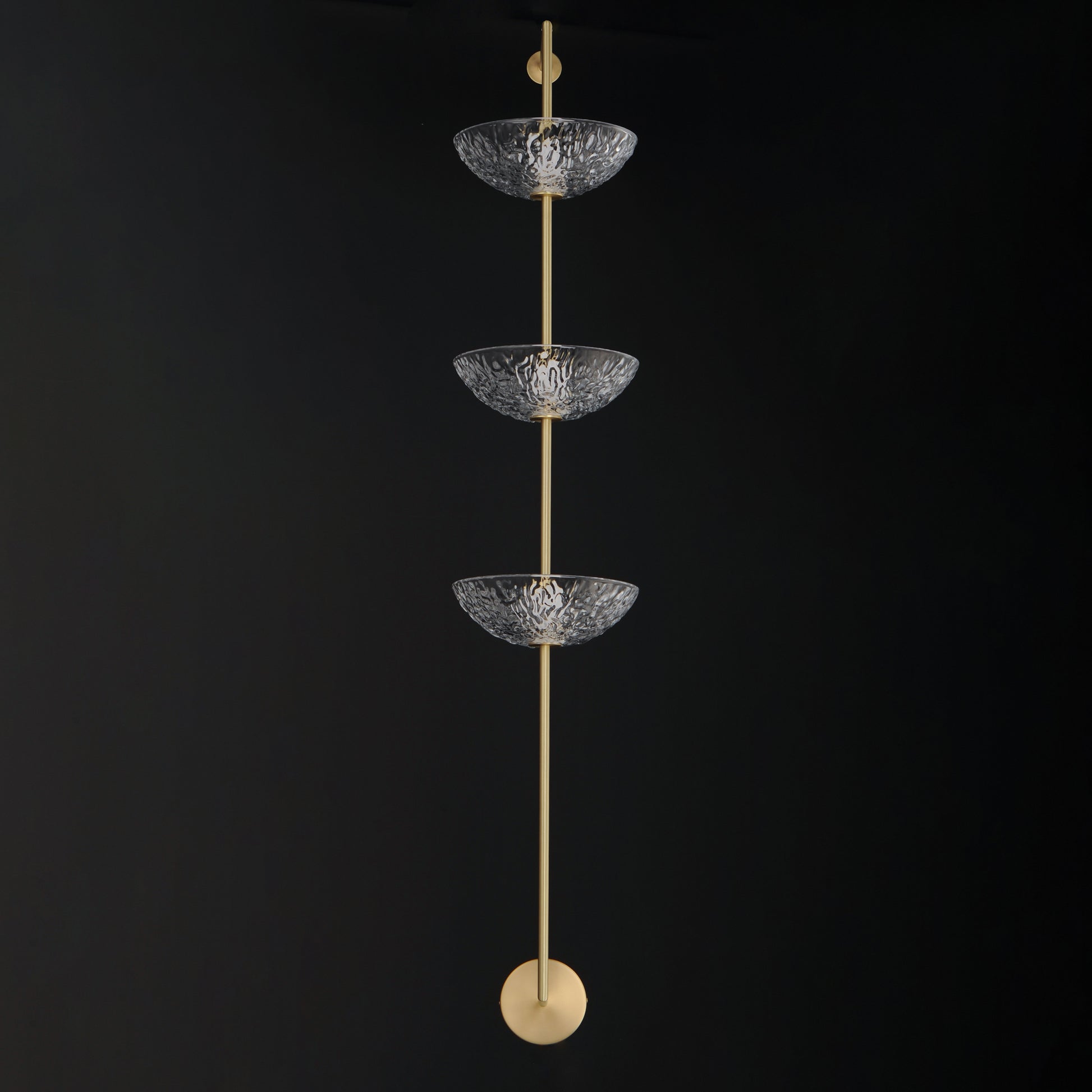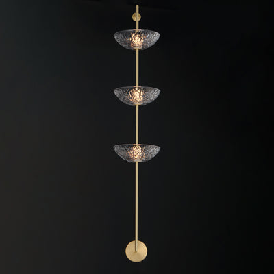A modern take on the classic torchiere, the bright Satin Brass frames support thick textured glass cauldrons illuminated with dedicated LED modules. The 2-Light pendant and swing arm pin-up sconce feature rotatable shades directing the light either upward or cast directionally downward. The deep pattern in the glass sparks curiosity and fascination with its organic and abstract surface. It creates interest in the LED light source behind it while casting even light through the artistic vessels' design. Available in various configurations of pendants and sconces, the collection celebrates classic design concepts in an understated contemporary glamor that results in a composition suited to transitional and contemporary aesthetics. Make a statement with the oversized with the 3-light sconce nearly five foot in height or use the multiple functional pieces for reading our over an island.