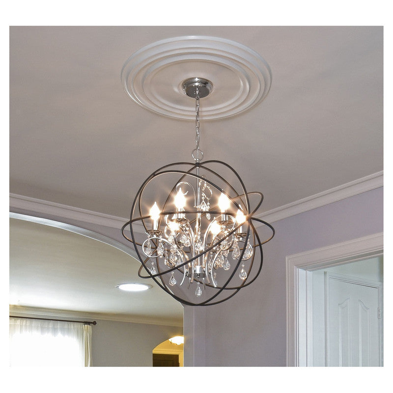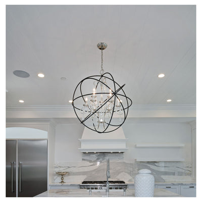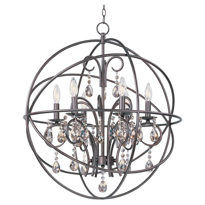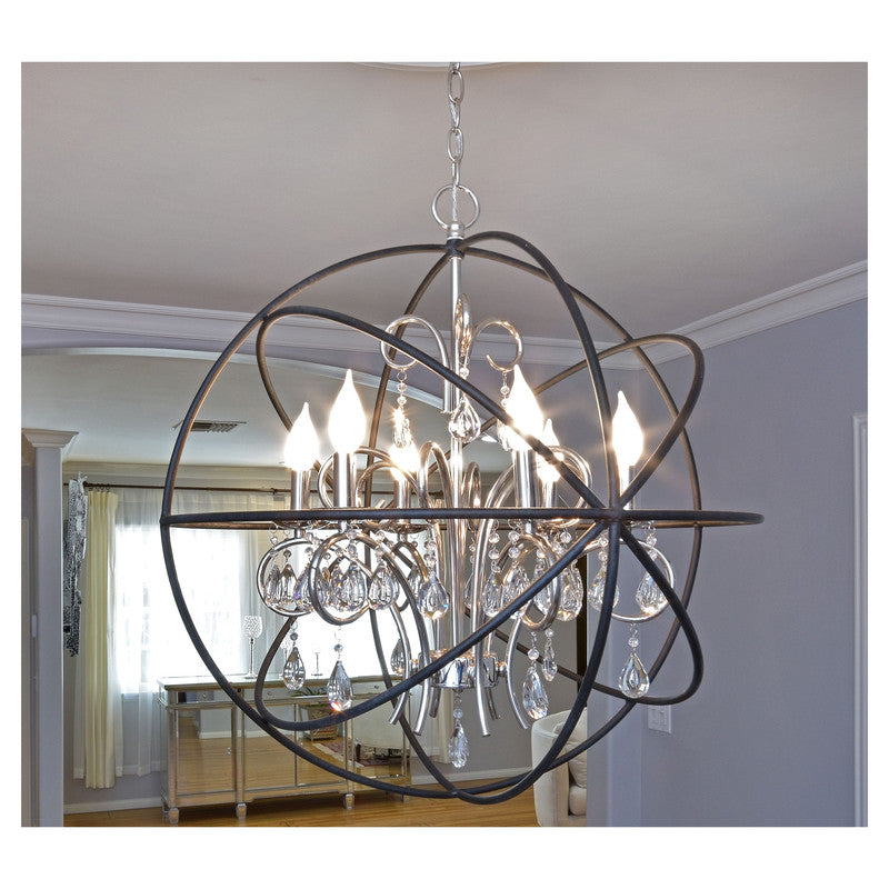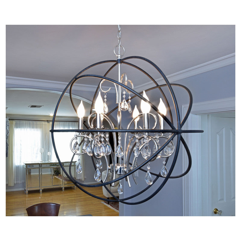A spherical frame of metal surround a simple line chandelier draped in crystal for a transitional style that fits any interior design. Orbit is available in 2 sizes and 2 finishes, Oil Rubbed Bronze with Cognac crystal and a combo finish of Anthracite and Polished Nickel with Clear crystal.