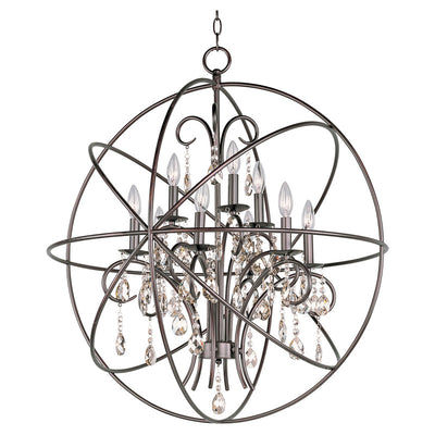 A spherical frame of metal surround a simple line chandelier draped in crystal for a transitional style that fits any interior design. Orbit is available in 2 sizes and 2 finishes, Oil Rubbed Bronze with Cognac crystal and a combo finish of Anthracite and Polished Nickel with Clear crystal.