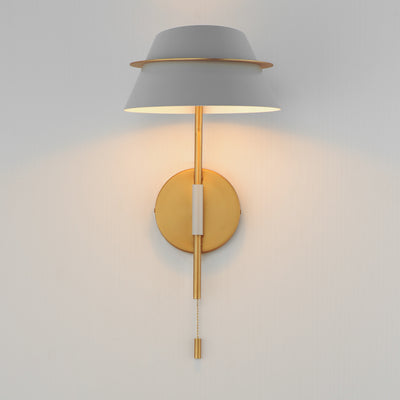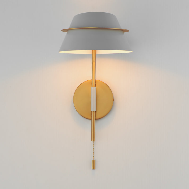 Metal shades of Light French Gray are suspended from halos of Natural Aged Brass. Maximizing the light output, the interior of the shades are painted white and their tops are left open casting light both upwards and below. The collection is completed by a delightful pull-chain operated wall sconce that provides a practical light source ideal for a reading nook or bedside.