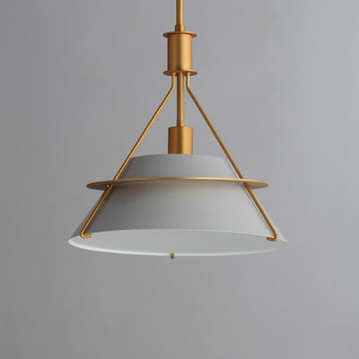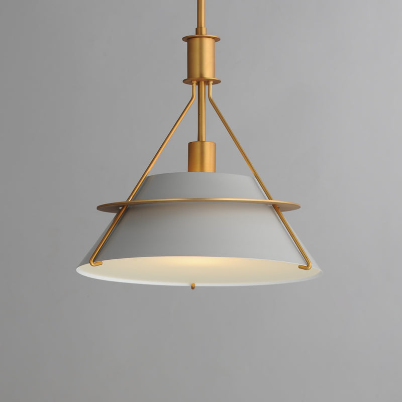 Metal shades of Light French Gray are suspended from halos of Natural Aged Brass. Maximizing the light output, the interior of the shades are painted white and their tops are left open casting light both upwards and below. The collection is completed by a delightful pull-chain operated wall sconce that provides a practical light source ideal for a reading nook or bedside.