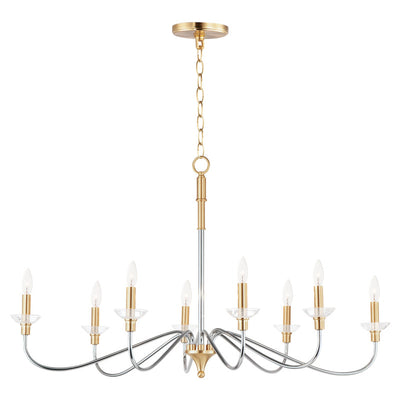 Combination of contemporary Polished Chrome and a softer Satin Brass revitalizes a classic form. Glass bobeches complete the look creating an airy and simple chandelier group. Get that casual luxe look with minimalistic, transitional forms.