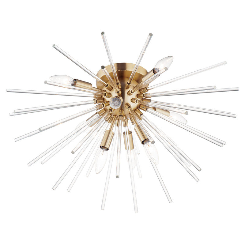 A dazzling burst of Clear glass rods extend from a classic sputnik shape finished in a bright Polished Chrome or warm Satin Brass. Available in two sizes of pendants and as a ceiling fixture, this unique look is a statement piece designed to attract attention.
