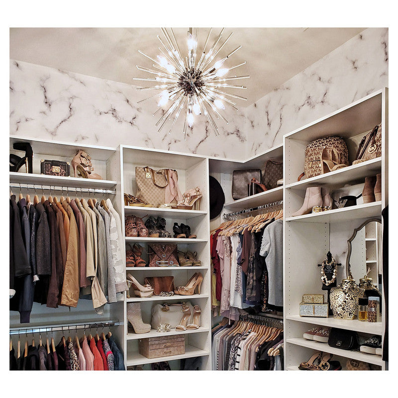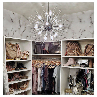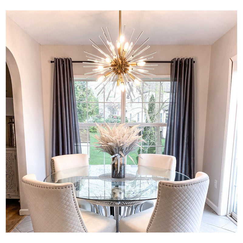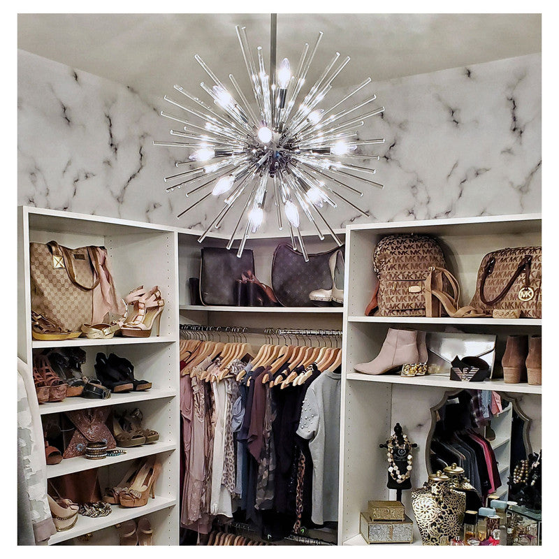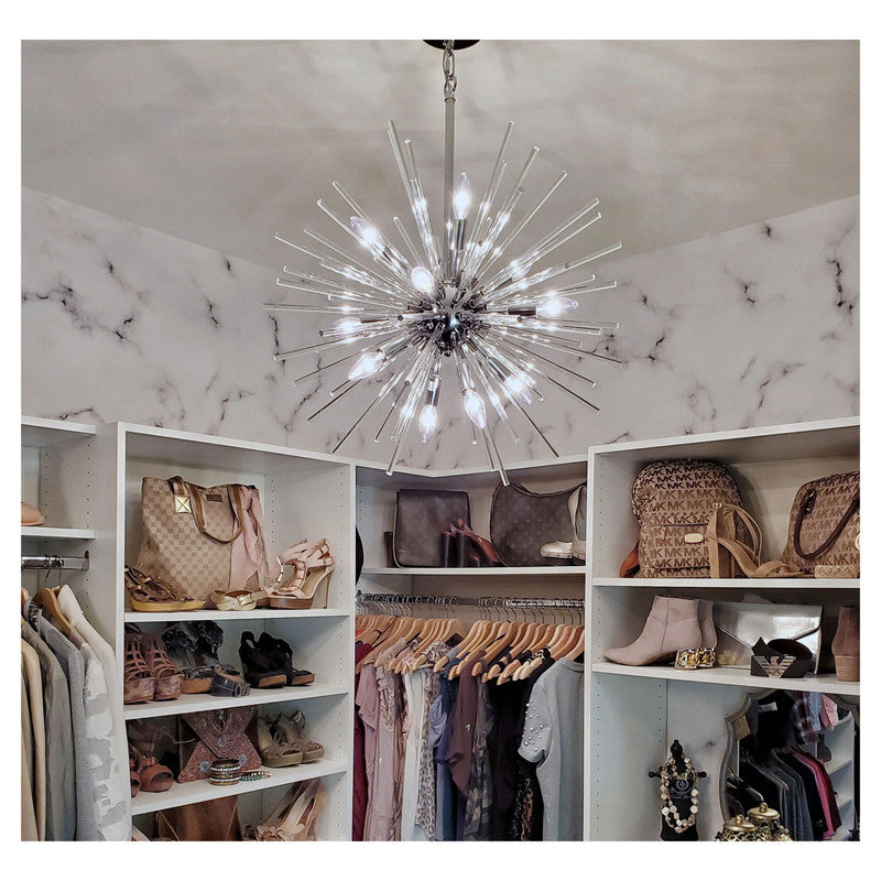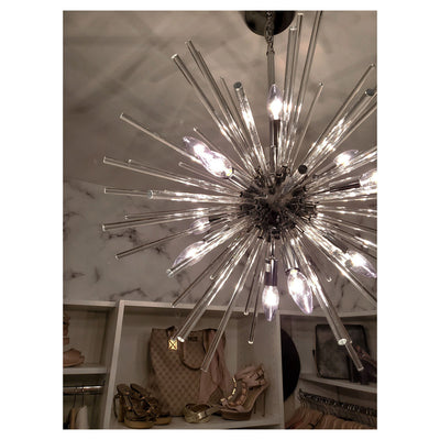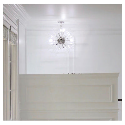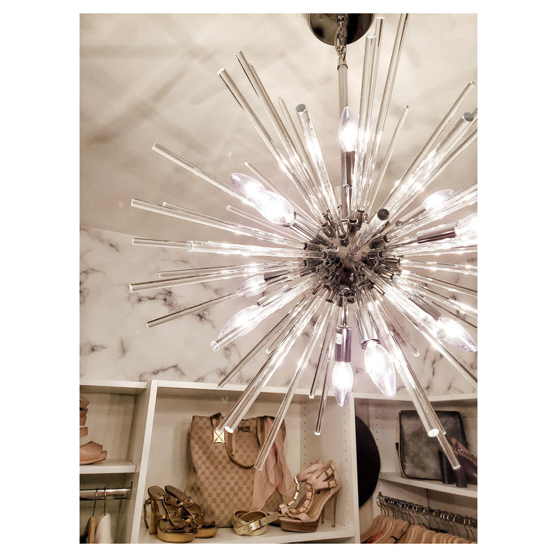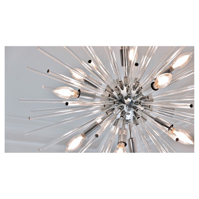 A dazzling burst of Clear glass rods extend from a classic sputnik shape finished in a bright Polished Chrome or warm Satin Brass. Available in two sizes of pendants and as a ceiling fixture, this unique look is a statement piece designed to attract attention.