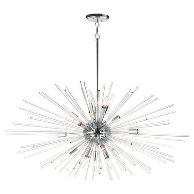 A dazzling burst of Clear glass rods extend from a classic sputnik shape finished in a bright Polished Chrome or warm Satin Brass. Available in two sizes of pendants and as a ceiling fixture, this unique look is a statement piece designed to attract attention.