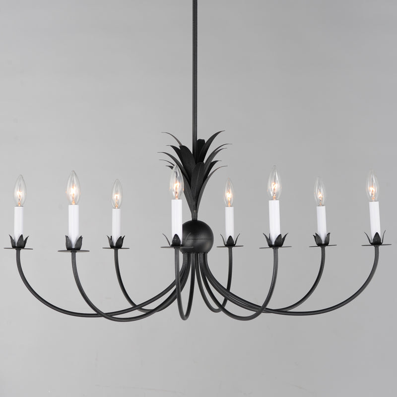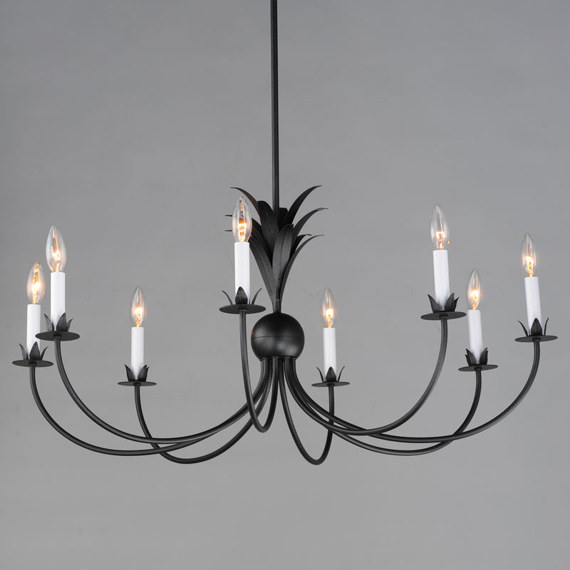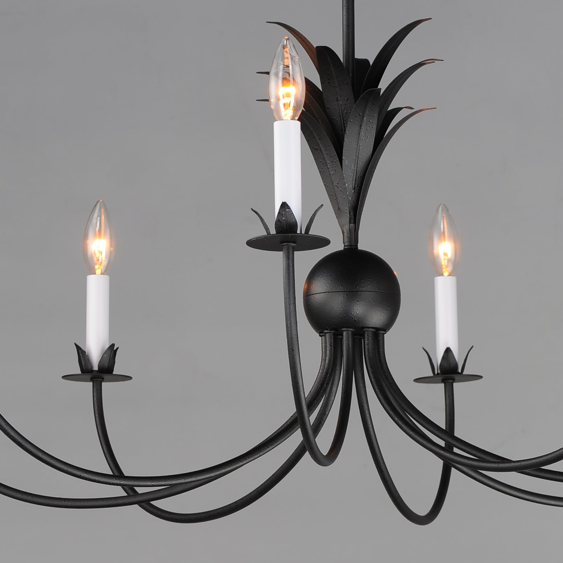 Effortlessly elegant, the biophilic details that adorn this classic chandelier transports you to an oasis indoors. The design, whether brilliantly gilt in Gold Leaf or hand painted in a dramatically textural Anthracite finish, exudes a timeless quality that is sure to please. The graceful form of these fixtures is constructed of slender metal tubes that sprout from a spherical collector at the center and Off-White metal candle covers that are designed to last.