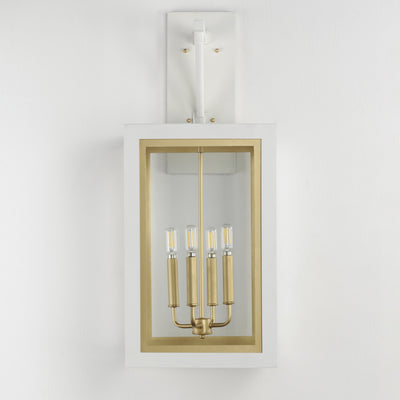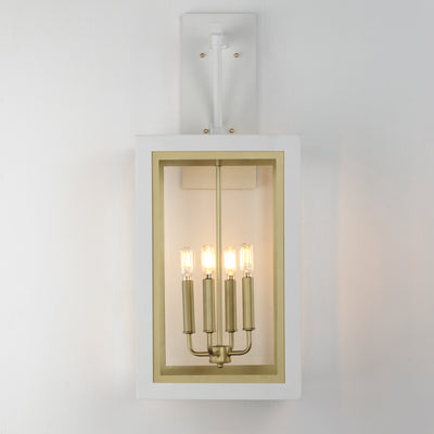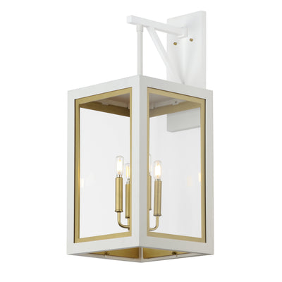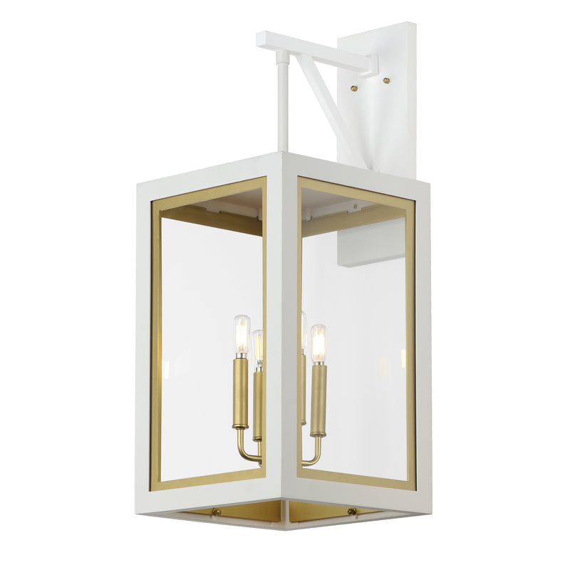 Two-tone frames of Black or White with internal Gold frames provides a neoclassical approach to the squared coach lantern. The sconces jut out from the wall on well-defined trusses that add a contemporary element. Delivering a classic design that suits most exteriors, this collection adds interest in the interior contrasting frame of Gold that secures clear glass panes to diffuse the lamp within.