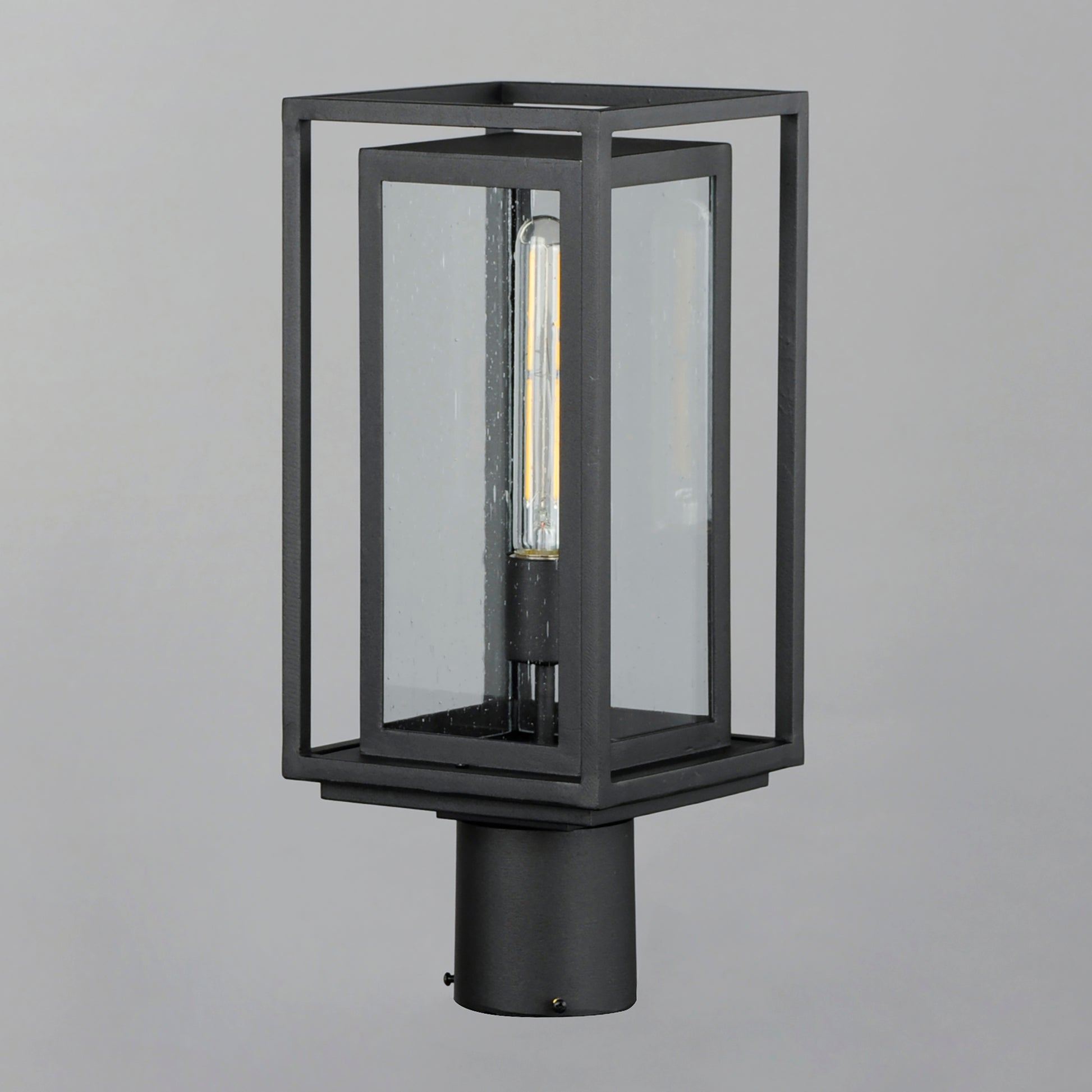 A dual framed structure creates dimension on these outdoor lighting fixtures that is both contemporary and transitional. The construction consists of two frames of square tubing and squared components. The inner frame's Clear Seedy glass reduces glare from the light and appears dirt-free for longer periods. This is a comprehensive collection to brighten all areas of your outdoor space, available in various sized sconces as well as hanging and post configurations.