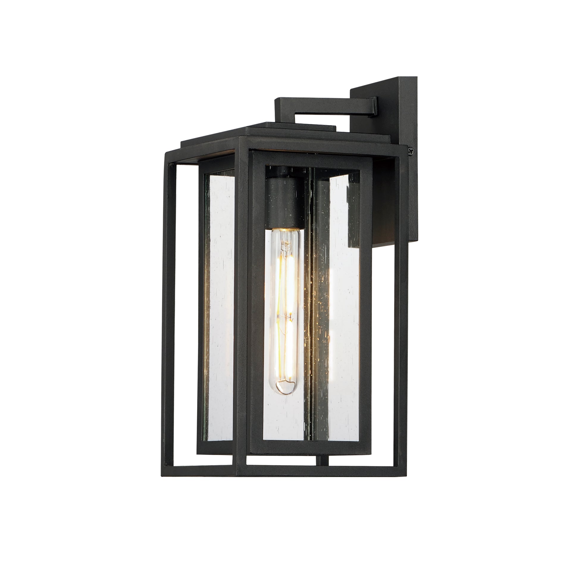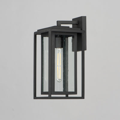 A dual framed structure creates dimension on these outdoor lighting fixtures that is both contemporary and transitional. The construction consists of two frames of square tubing and squared components. The inner frame's Clear Seedy glass reduces glare from the light and appears dirt-free for longer periods. This is a comprehensive collection to brighten all areas of your outdoor space, available in various sized sconces as well as hanging and post configurations.