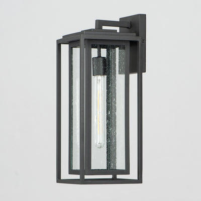 A dual framed structure creates dimension on these outdoor lighting fixtures that is both contemporary and transitional. The construction consists of two frames of square tubing and squared components. The inner frame's Clear Seedy glass reduces glare from the light and appears dirt-free for longer periods. This is a comprehensive collection to brighten all areas of your outdoor space, available in various sized sconces as well as hanging and post configurations.