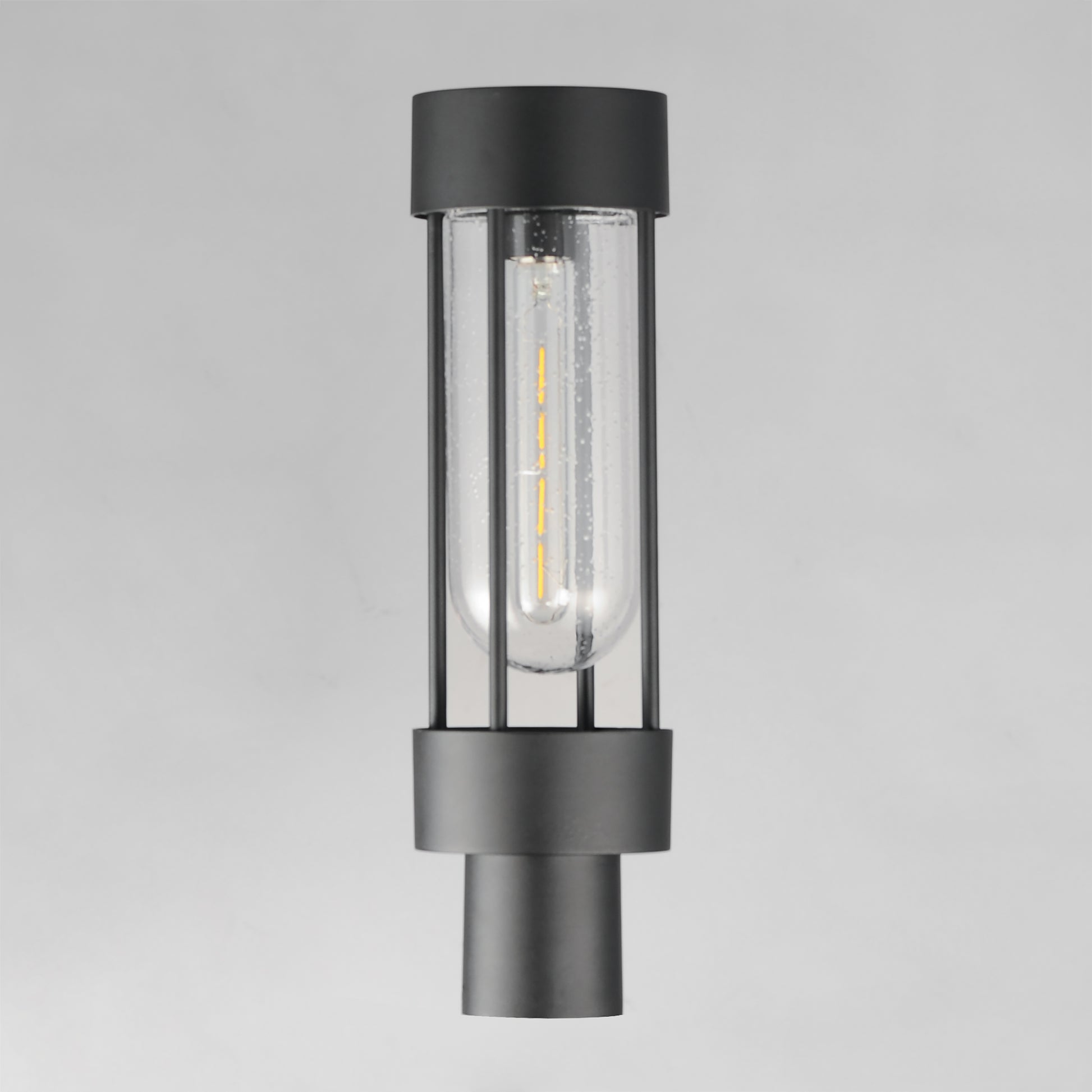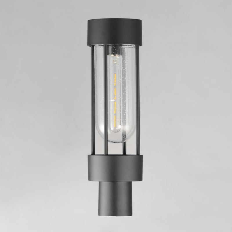 Clean and contemporary, this series of wet location rated outdoor sconces features a capsule of Clear Seeded glass encased within a cage of matte Black outdoor rated powder coat. The transitional appeal of the design pairs well in applications both modern and traditional. Complete the look with a tubular filament lamp.