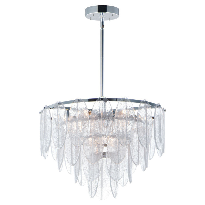 Hand formed glass petals suspend from a tiered frame of Polished Chrome. The glass is transparent yet cloudy, softly diffusing the light while creating a clean and crisp design.