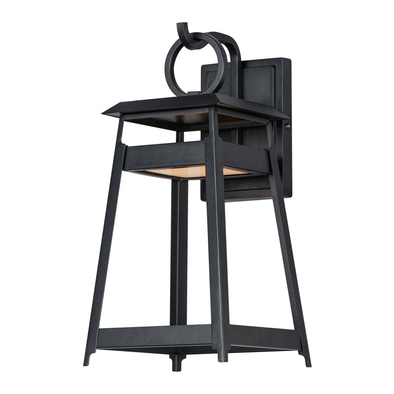 An impactful shrine of light, the modern lantern designs of the Pagoda series feature a stacked structure with slanted roof lines over an open pavilion free of glass. The LED light source is contained in the lower structure provides ample light downwards in addition to casting light upwards to create a warm glow within the frame. A large, flattened ring perches above the lanterns, which are then supported by hooks on the larger sizes. The fixtures are made more robust by eliminating the use of glass panels entirely. Finished in matte Black, these outdoor sconces are stylishly contemporary.