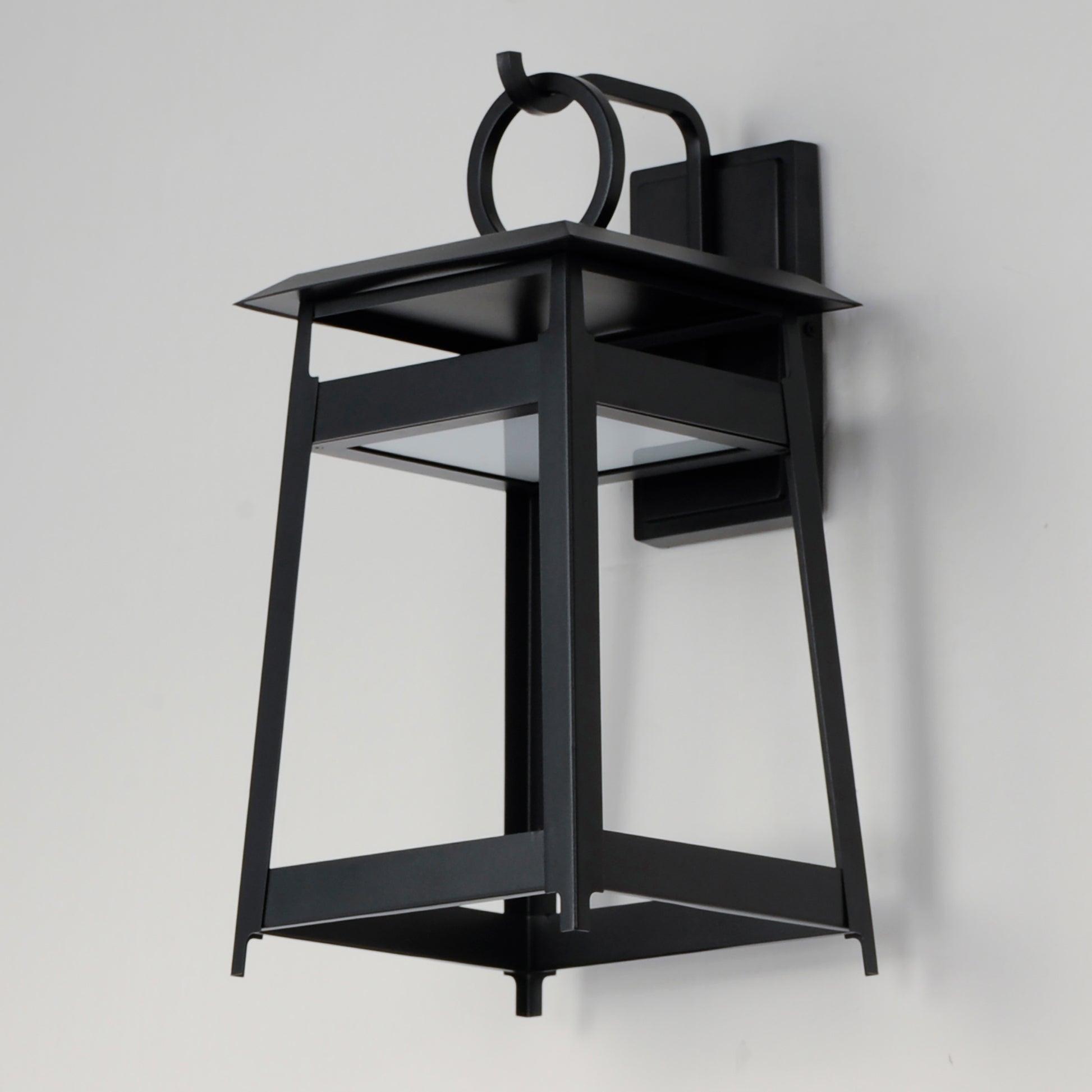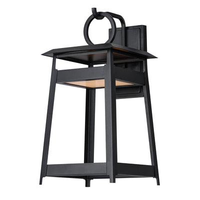An impactful shrine of light, the modern lantern designs of the Pagoda series feature a stacked structure with slanted roof lines over an open pavilion free of glass. The LED light source is contained in the lower structure provides ample light downwards in addition to casting light upwards to create a warm glow within the frame. A large, flattened ring perches above the lanterns, which are then supported by hooks on the larger sizes. The fixtures are made more robust by eliminating the use of glass panels entirely. Finished in matte Black, these outdoor sconces are stylishly contemporary.