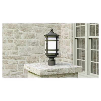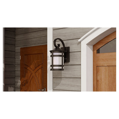 Old World styling in a durable die cast aluminum finished in Anthracite creates a forged iron look with a modern twist. The rustic look of the metal contrasts nicely with the light effect of the ribbed Constellation glass.