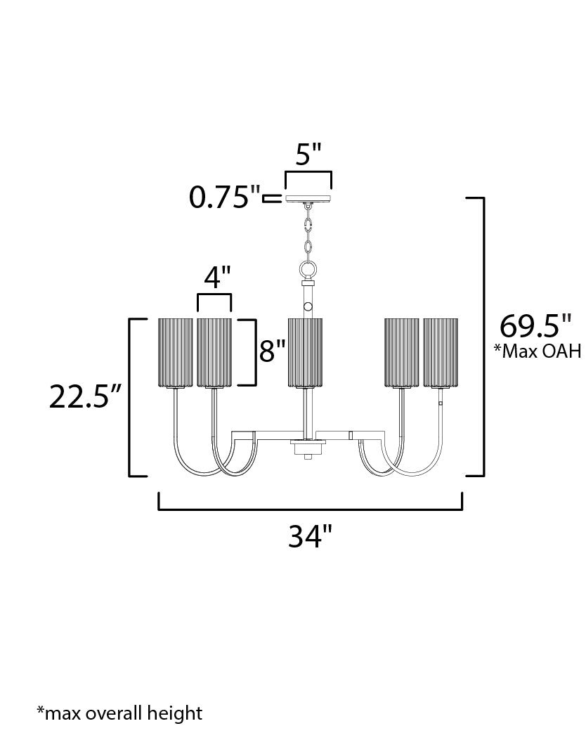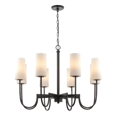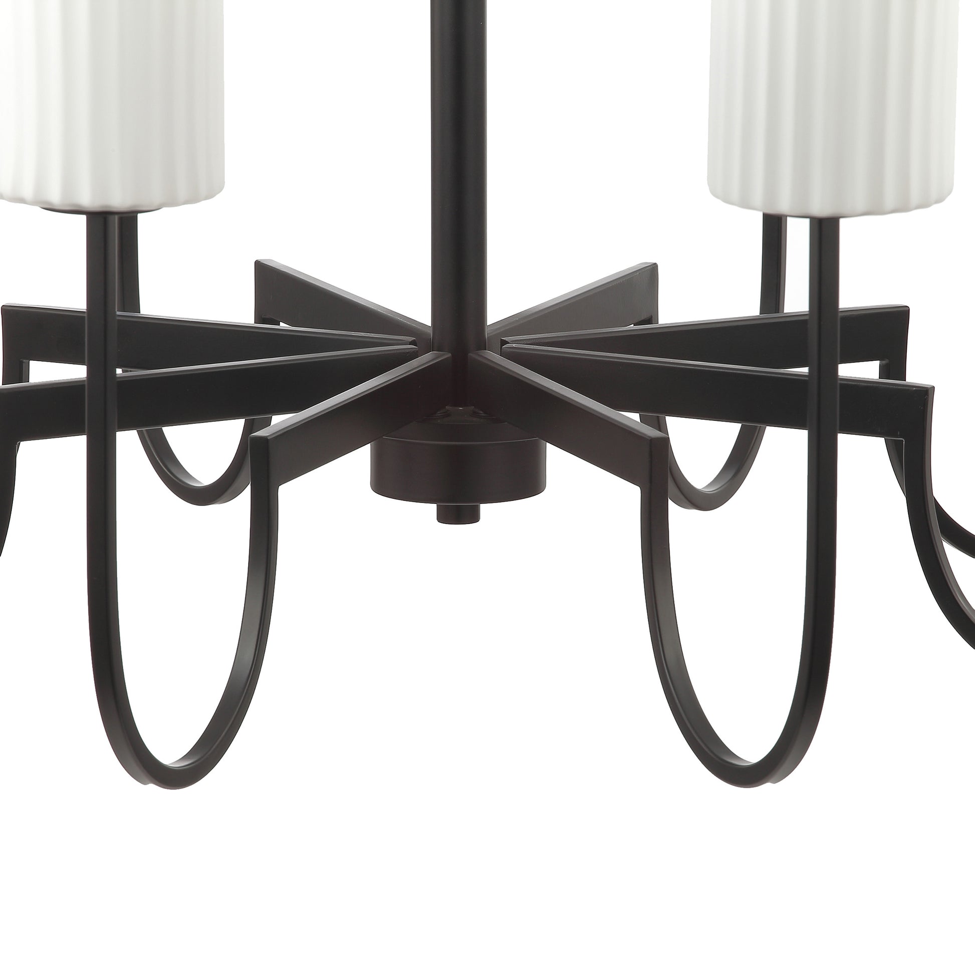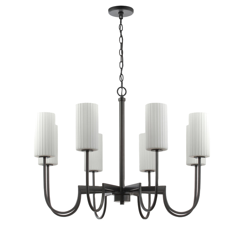 Whether in town or countryside, this collection of chandeliers simplifies the classic curved frame with a modern approach. Finished in your choice of Satin Brass or Matte Black, the sharply curved arms extend higher than classic proportions and support ribbed cylinders of opal white glass shades. These Satin White glasses upgrade pleated shades by form of their ribbed details. Available in two sizes of chandelier and a linear 4-light pendant, this collection finds its place at home in a variety of applications and fits in regardless of whether its town or country.