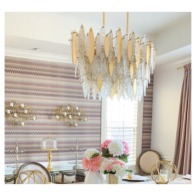 Hand-formed glass petals of Clear and Champagne-tint suspend from a tiered frame of gold and accented with petals of solid metal finished in Gold Leaf. Numerous candelabra sockets are strategically placed within the fixture to create glimmer and elegance to this majestic collection.