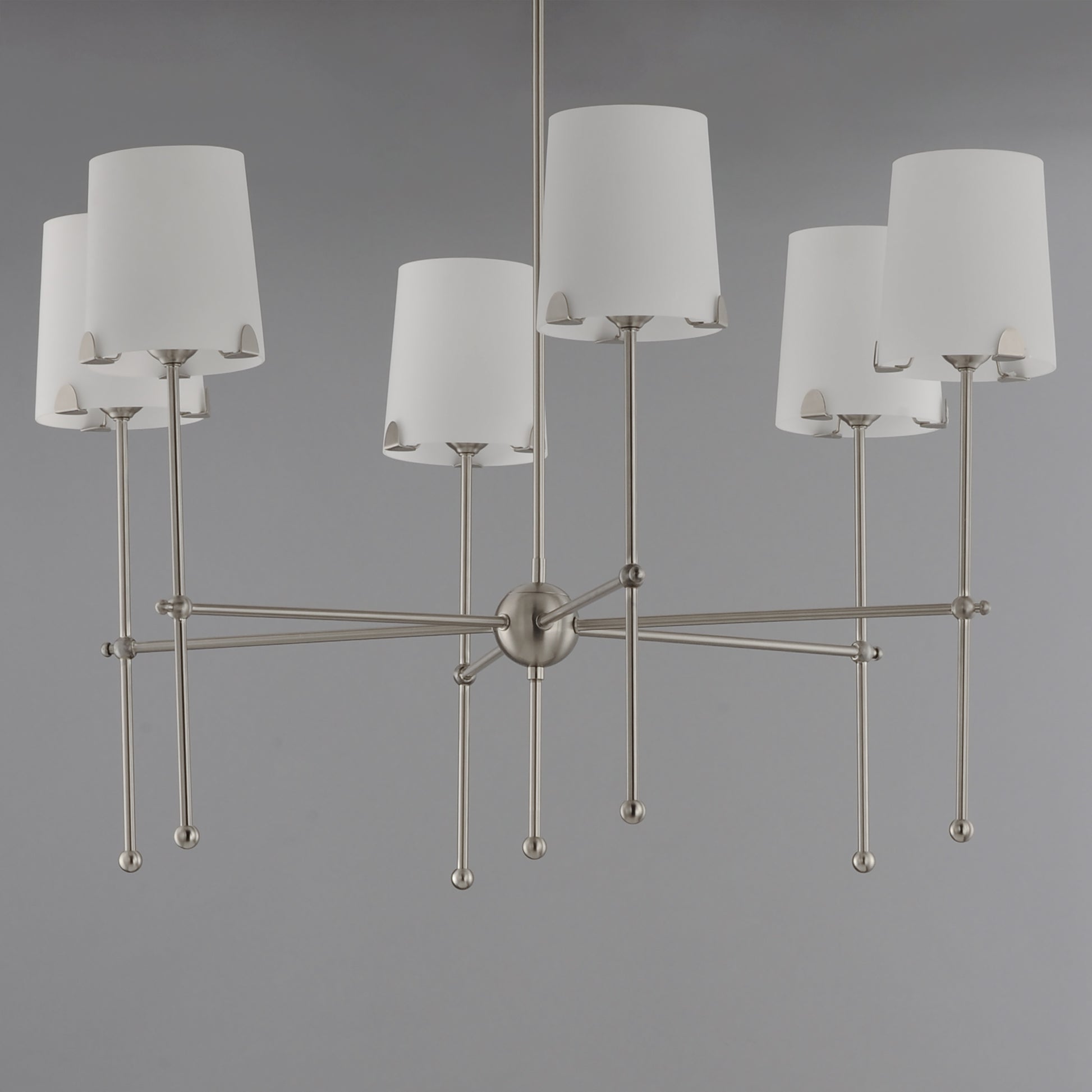 Satin White shades taper in a classic fabric shade shape and rest on elegantly thin frames of Satin Brass or Satin Nickel. They are supported secured by a mostly concealed structure with coordinating semicircular tabs that complement the spherical joints of the frame. The modern design details and updated shade materials refresh the outlook of a timeless chandelier though its use of thoughtful features.