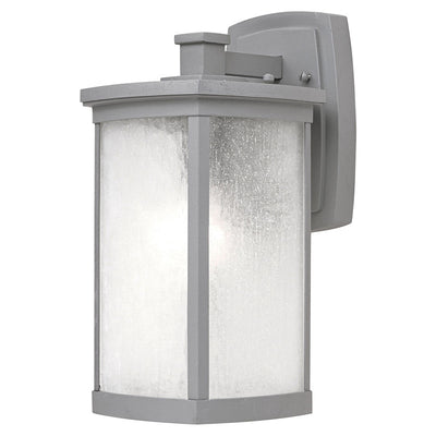Simple lines create a transitional style that fits a wide variety of exterior home design. Available in both Platinum or Bronze finish, Frosted Seedy or Clear Ribbed glass, or fluorescent, incandescent or LED lamping.