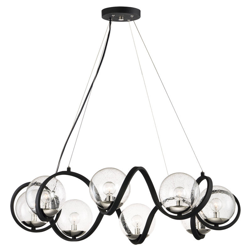 Rectangular metal channel, finished in Black, is meticulously formed in a curl design to create a unique and dramatic design. Clear Seedy glass balls supported by cups of Polished Nickel are strategically positioned to balance out the design.