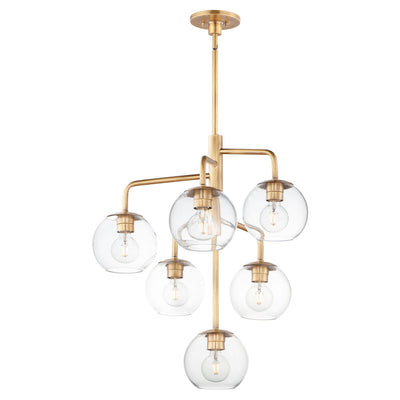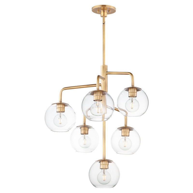 Vessels of heavy weight Clear glass are supported on frames of solid brass finished in a hand rubbed Natural Aged Brass finish. A versatile collection of up and down configurations which can be directly attached to the canopy or extended down by the rods supplied.