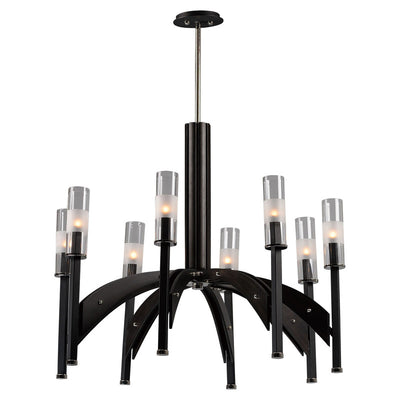 A modern classic created using mixed medium in complimentary finishes that come together to compose a beautiful art form. Available in your choice of Wenge wood with Black and Polished Nickel accents or Antique Pecan wood with Bronze and Satin Brass. Tall Clear glass cylinders with a frosted band complement the scale of the design.
